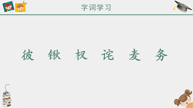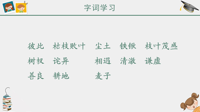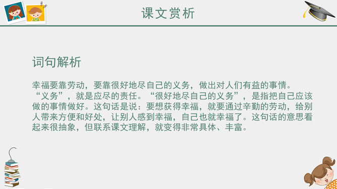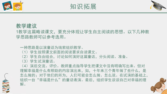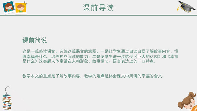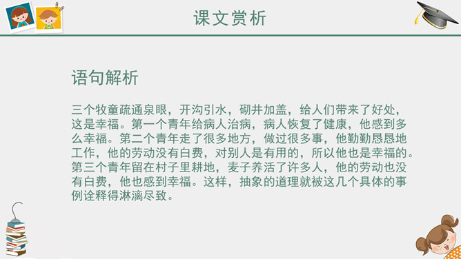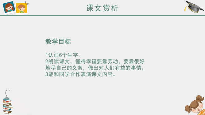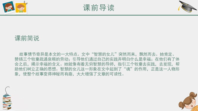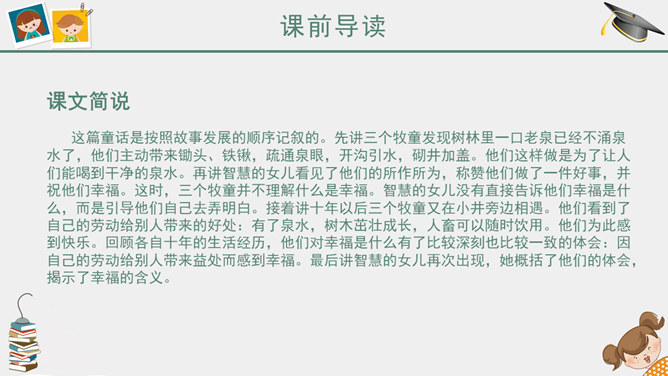课前简说:故事情节奇异是本文的一大特点。文中“智慧的女儿”突然而来,飘然而去。她肯定、赞扬三个牧童疏通泉眼的劳动;引导他们通过自己的实践弄明白什么是幸福;在他们有了体会之后,揭示幸福的含义。她就像有着无穷智慧的导师,指引三个牧童去实践,去发现,帮助他们树立正确的思想。智慧的女儿这一形象在文中起到了“魂”的作用,正是这一人物形象,使整个故事变得神秘而有趣,大大增强了文章的可读性。幸福要靠劳动,要靠很好地尽自己的义务,做出对人们有益的事情。“义务”,就是应尽的责任。“很好地尽自己的义务”,是指把自己应该做的事情做好。这句话是说:要想获得幸福,就要通过辛勤的劳动,给别人带来方便和好处,让别人感到幸福,自己也就幸福了。这句话的意思看起来很抽象,但联系课文理解,就变得非常具体、丰富。教学目标,认识6个生字。朗读课文,懂得幸福要靠劳动,要靠很好地尽自己的义务,做出对人们有益的事情。能和同学合作表演课文内容。