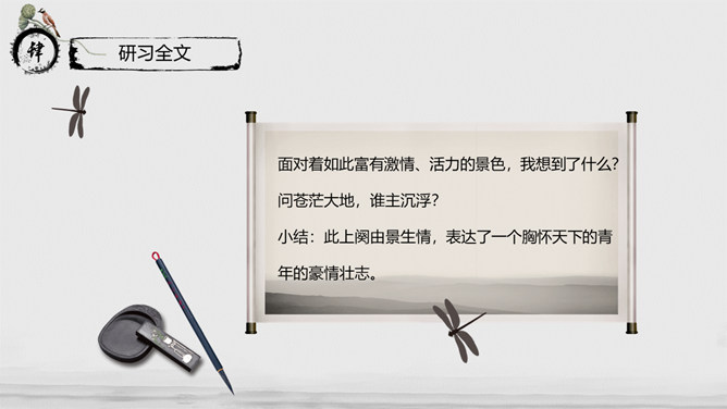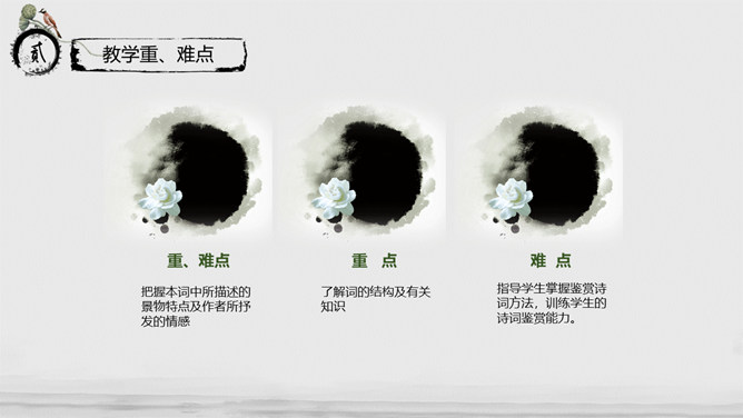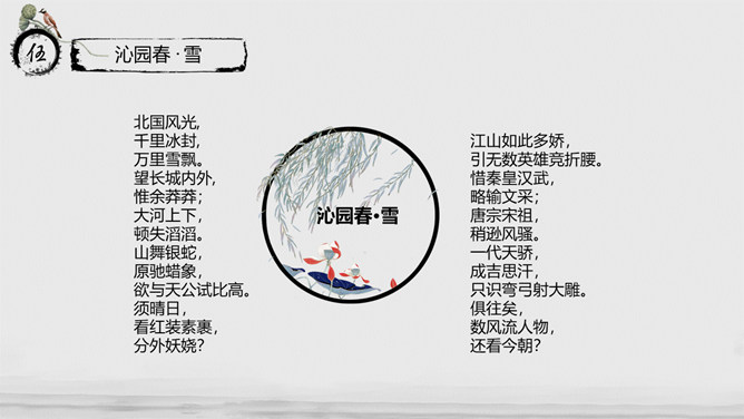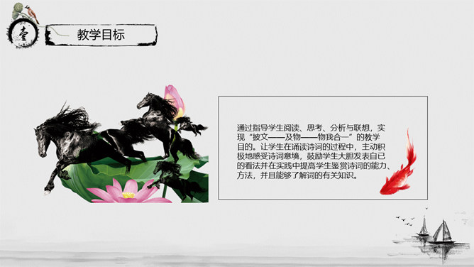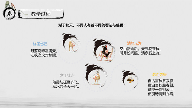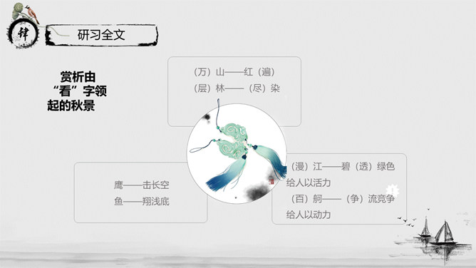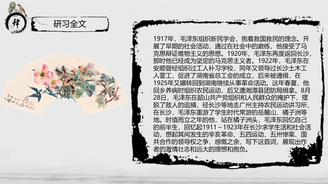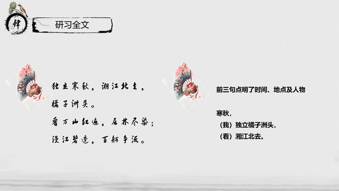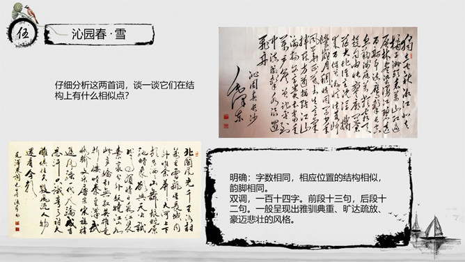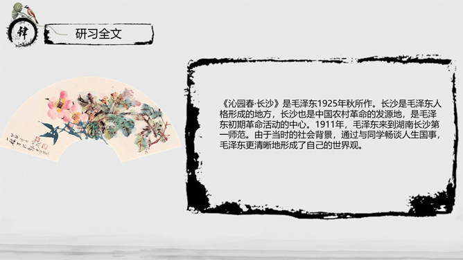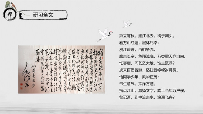 教学目标:通过指导学生阅读、思考、分析与联想,实现“披文——及物——物我合一”的教学目的。让学生在诵读诗词的过程中,主动积极地感受诗词意境,鼓励学生大胆发表自已的看法并在实践中提高学生鉴赏诗词的能力、方法,并且能够了解词的有关知识。教学重、难点:把握本词中所描述的景物特点及作者所抒发的情感。了解词的结构及有关知识。指导学生掌握鉴赏诗词方法,训练学生的诗词鉴赏能力。《沁园春·长沙》是毛泽东1925年秋所作。长沙是毛泽东人格形成的地方,长沙也是中国农村革命的发源地,是毛泽东初期革命活动的中心。1911年,毛泽东来到湖南长沙第一师范。由于当时的社会背景,通过与同学畅谈人生国事,毛泽东更清晰地形成了自己的世界观。用一句总结性的话概述此秋景特征:万类霜天竞自由。面对着如此富有激情、活力的景色,我想到了什么?问苍茫大地,谁主沉浮?小结:此上阕由景生情,表达了一个胸怀天下的青年的豪情壮志。