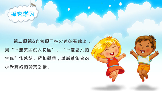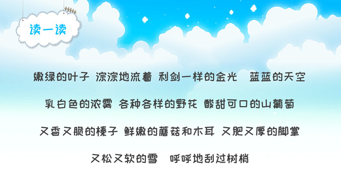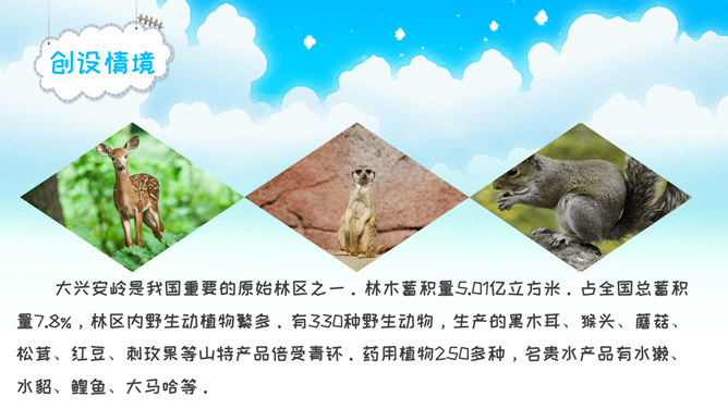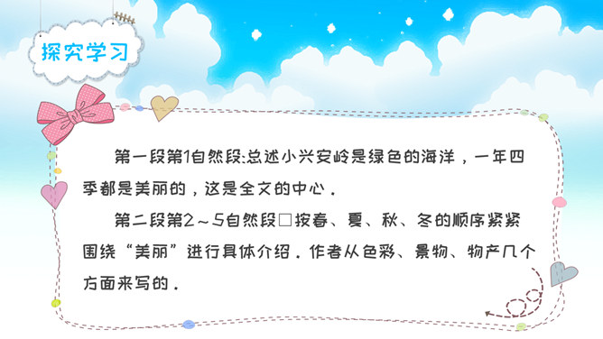 大兴安岭地区是我国最北,纬度最高的地区。总面积8.46万平方公里,总人口54万,边境线长791.5公里,与俄罗斯联邦隔江相望。 大兴安岭的山水景色奇秀,冰雪风光绚丽,最著名的旅游胜地——黑龙江源头蔚为壮观。沿着两岸风光旋旎,绿水青山美不胜收。读一读:嫩绿的叶子 淙淙地流着 利剑一样的金光 蓝蓝的天空 乳白色的浓雾 各种各样的野花 酸甜可口的山葡萄 又香又脆的榛子 鲜嫩的蘑菇和木耳 又肥又厚的脚掌 又松又软的雪 呼呼地刮过树梢。“封”字形象地表现了树木枝叶遮天蔽日、又密又厚的景象.又显示出树木在夏天生长的勃勃生机。“夏天,树木长得葱葱茏茏,密密层层的枝叶把森林封得严严实实的,挡住了人们的视线,遮住了蓝蓝的天空。”第一段第1自然段:总述小兴安岭是绿色的海洋,一年四季都是美丽的,这是全文的中心。第二段第2~5自然段)按春、夏、秋、冬的顺序紧紧围绕“美丽”进行具体介绍。作者从色彩、景物、物产几个方面来写的。所属专题:美丽的小兴安岭ppt。