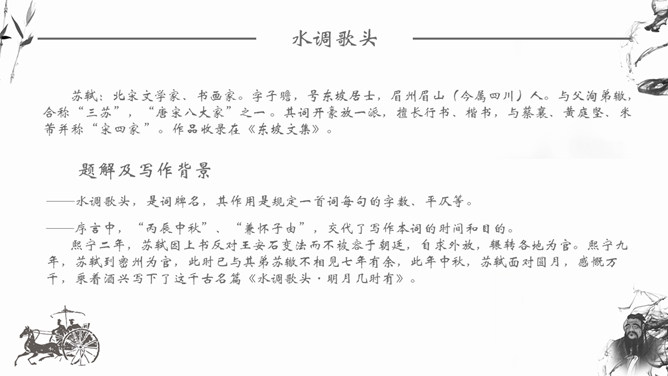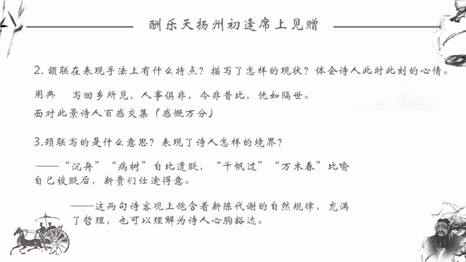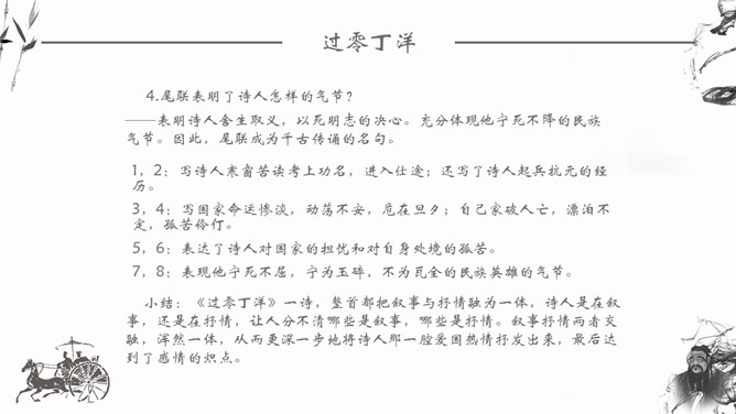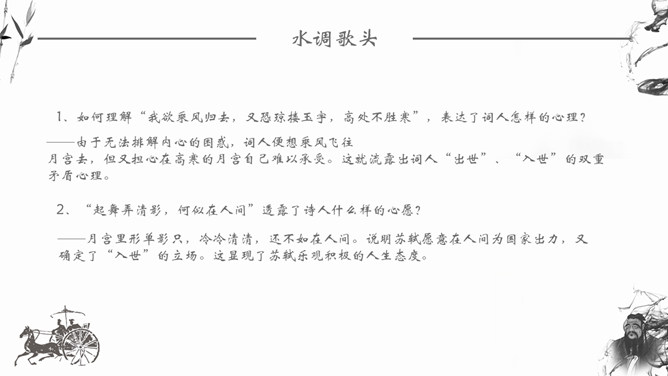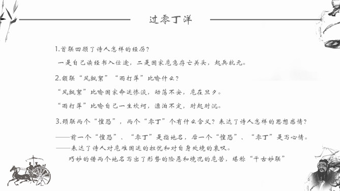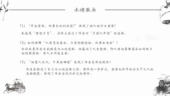 首联回顾了诗人怎样的经历?一是自己读经书入仕途,二是国家危急存亡关头,起兵抗元。颔联“风飘絮”“雨打萍”比喻什么?“风飘絮”比喻国家命运惨淡,动荡不安,危在旦夕。“雨打萍”比喻自己一生坎坷,漂泊不定,时起时沉。颈联两个“惶恐”,两个“零丁”个有什么含义?表达了诗人怎样的思想感情?前一个“惶恐”、“零丁”是指地名,后一个“惶恐”、“零丁”是写心情。表达了诗人对危难国运的担忧和对自身处境的哀叹。巧妙的借两个地名写出了形势的险恶和境况的危苦,堪称“千古妙联”。尾联表明了诗人怎样的气节?表明诗人舍生取义,以死明志的决心。充分体现他宁死不降的民族气节。因此,尾联成为千古传诵的名句。如何理解“我欲乘风归去,又恐琼搂玉宇,高处不胜寒”,表达了词人怎样的心理? 由于无法排解内心的困惑,词人便想乘风飞往月宫去,但又担心在高寒的月宫自己难以承受。这就流露出词人“出世”、“入世”的双重矛盾心理。不应有恨,何事长向别时圆?” 体现了词人的什么感情? 表面是“埋怨月亮”,实际上表达了作者对“月圆人不圆”的遗憾。