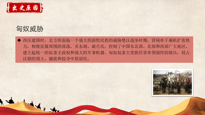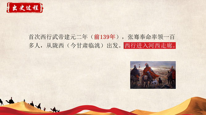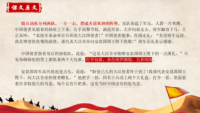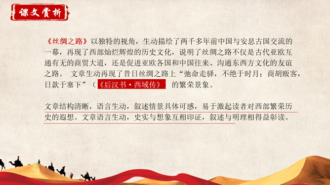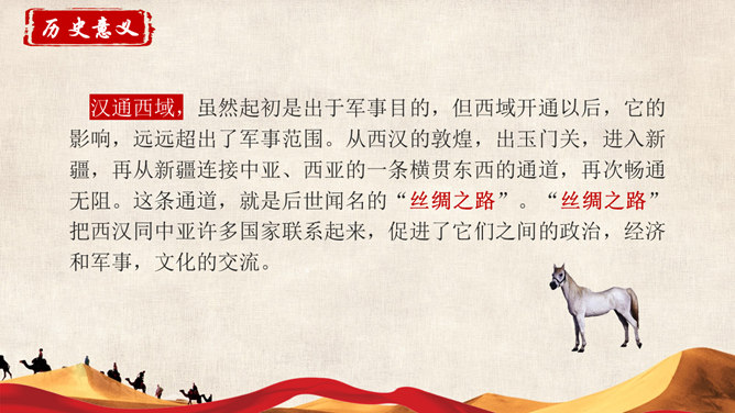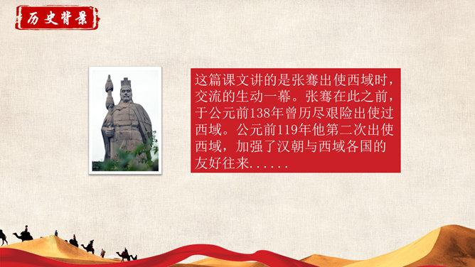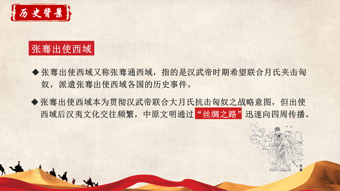 这篇课文讲的是张骞出使西域时,交流的生动一幕。张骞在此之前,于公元前138年曾历尽艰险出使过西域。公元前119年他第二次出使西域,加强了汉朝与西域各国的友好往来...... 张骞出使西域本为贯彻汉武帝联合大月氏抗击匈奴之战略意图,但出使西域后汉夷文化交往频繁,中原文明通过“丝绸之路”迅速向四周传播。张骞出使西域又称张骞通西域,指的是汉武帝时期希望联合月氏夹击匈奴,派遣张骞出使西域各国的历史事件。西汉建国时,北方即面临一个强大的游牧民族的威胁楚汉战争时期,冒顿单于乘机扩张势力,相继征服周围的部落,灭东胡、破月氏,控制了中国东北部、北部和西部广大地区,建立起统一的奴隶主政权和强大的军事机器。匈奴奴隶主贵族经常率领强悍的骑兵,侵占汉朝的领土,骚扰和掠夺中原居民。默读并思考:丝绸之路的作用是什么?请用――画下来。全班交流:丝绸之路的作用――成为促进亚欧交流和人类文明发展的纽带。