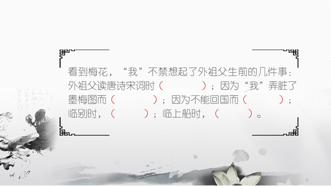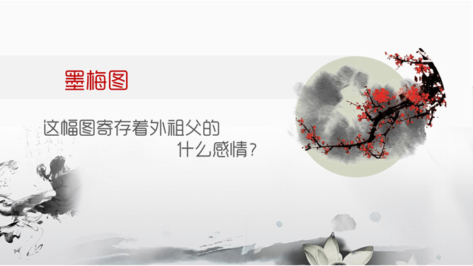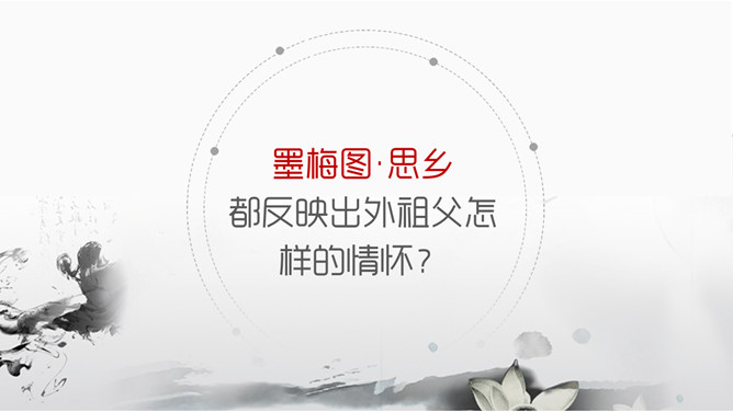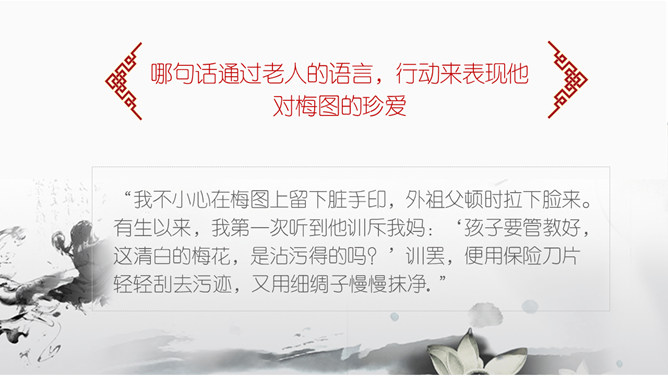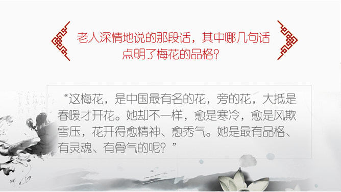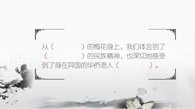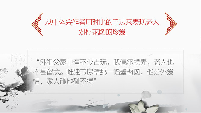 墨梅图,这幅图寄存着外祖父的什么感情?墨梅图·思乡都反映出外祖父怎样的情怀?颇负盛名 ,解析:颇,相当地。负,享有。盛名,很大的名望。颇负盛名,有很大的名望。顶天立地,解析:头顶青天,脚立在地上。形容光明正大,形象高大,气概豪迈。不甚在意,解析:不怎么放在心上 不甚: 1.表示程度不很高。 在意: 1.留意;放在心上。从中体会作者用对比的手法来表现老人对梅花图的珍爱。老人深情地说的那段话,其中哪几句话点明了梅花的品格?哪句话通过老人的语言,行动来表现他对梅图的珍爱。妙笔生花写诗或文:倾吐你想对海外游子说的话。搜集赞颂梅花的诗句,学做有梅花的秉性的人。所属专题:梅花魂ppt。