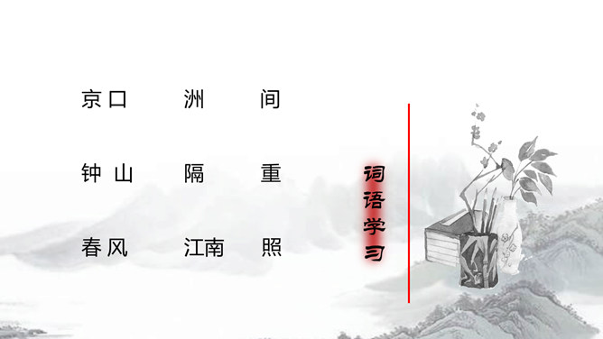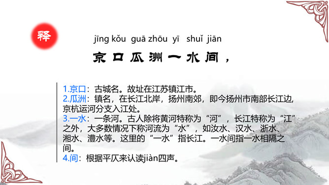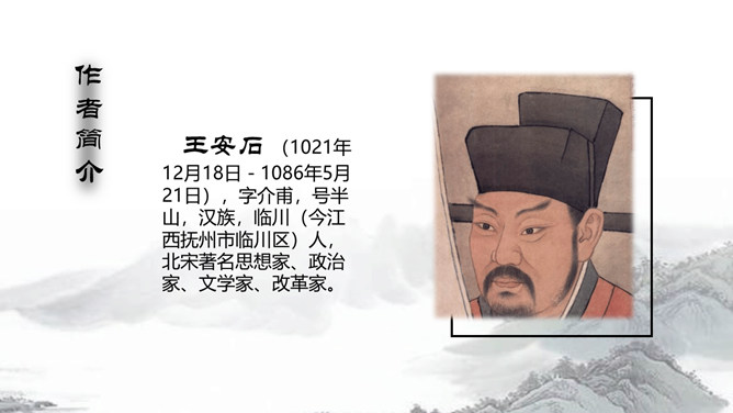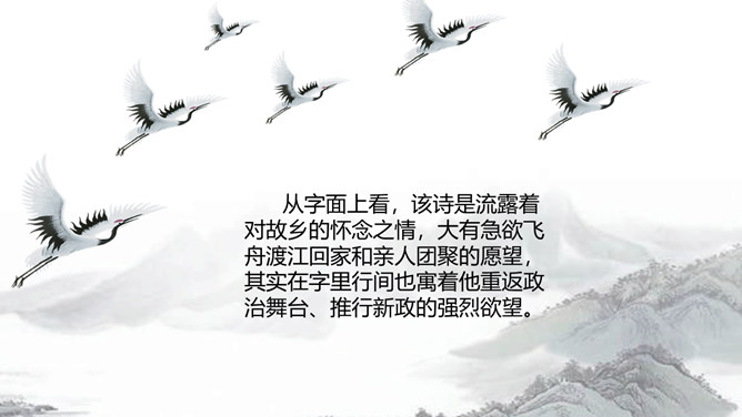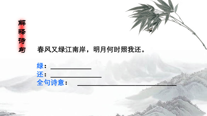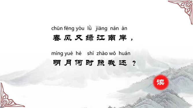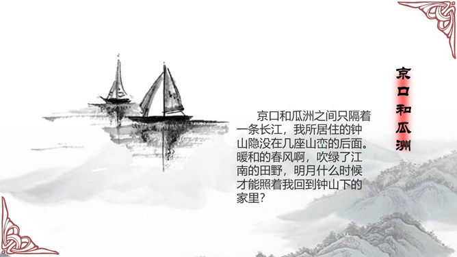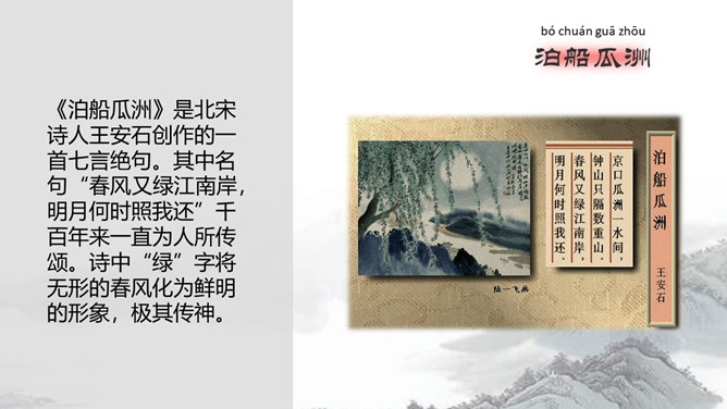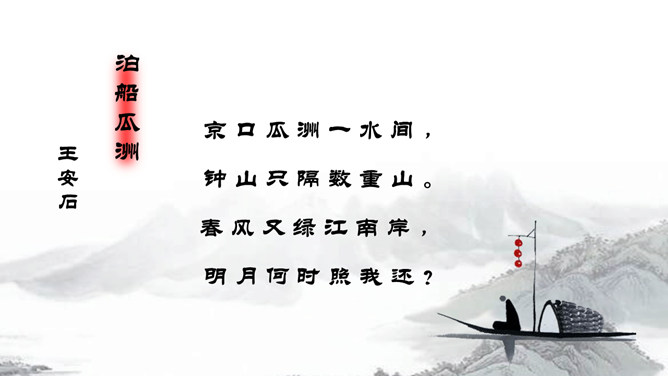 其中名句“春风又绿江南岸,明月何时照我还”千百年来一直为人所传颂。诗中“绿”字将无形的春风化为鲜明的形象,极其传神。从字面上看,该诗是流露着对故乡的怀念之情,大有急欲飞舟渡江回家和亲人团聚的愿望,其实在字里行间也寓着他重返政治舞台、推行新政的强烈欲望。京口和瓜洲之间只隔着一条长江,我所居住的钟山隐没在几座山峦的后面。暖和的春风啊,吹绿了江南的田野,明月什么时候才能照着我回到钟山下的家里?“文字频改,工夫自出。”(《童蒙诗训》)本诗曾获得“超然迈伦,能追逐李杜陶谢”(《彦周诗话》)的赞誉。这正是“频改”所致。但这首诗的佳处,并不限于一字之工,当玩赏其全篇的精神所在,方能得其体要。面对明月,你还能想起哪些思乡诗?所属专题:泊船瓜洲ppt。