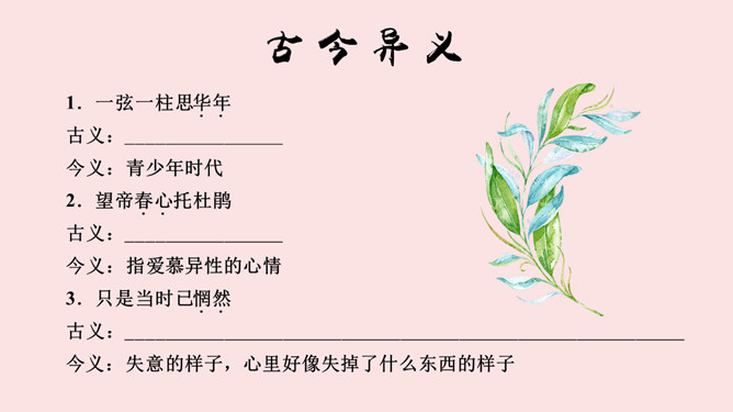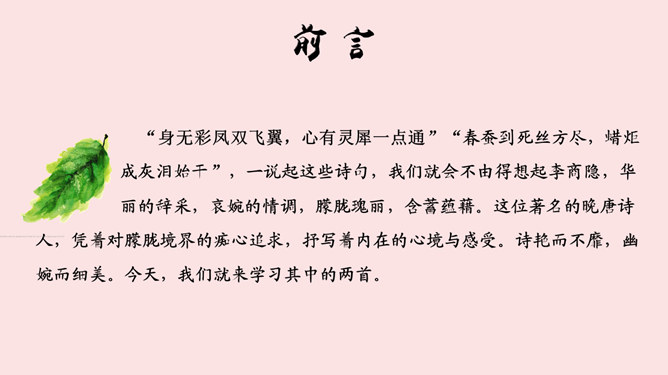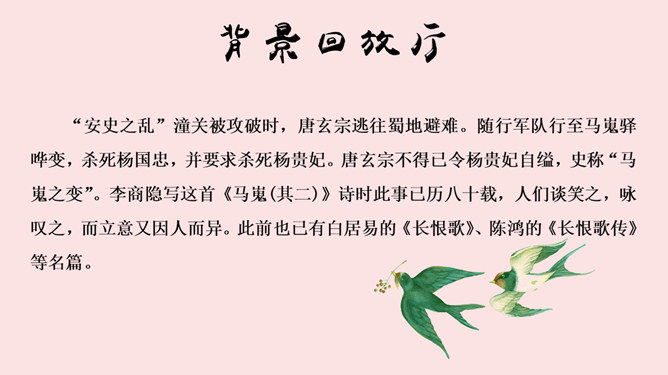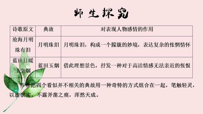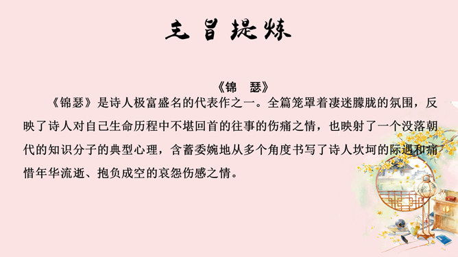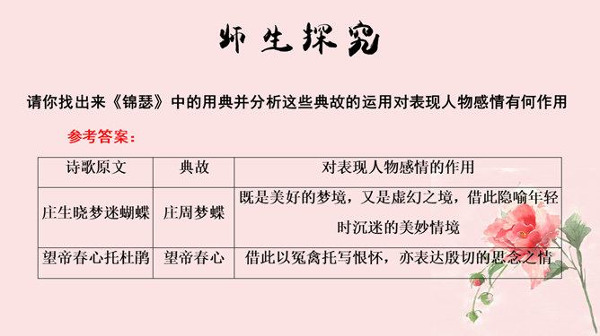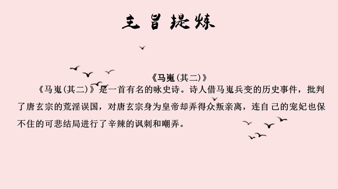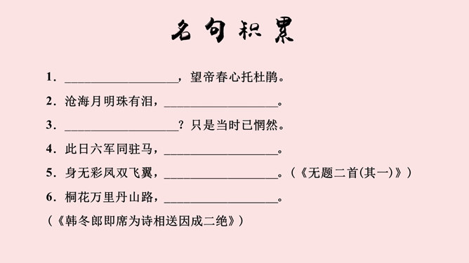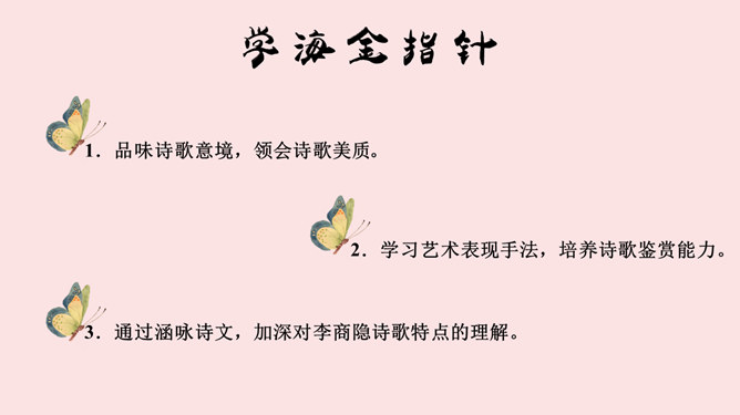 学海金指针,1、品味诗歌意境,领会诗歌美质。2、学习艺术表现手法,培养诗歌鉴赏能力。3、通过涵咏诗文,加深对李商隐诗歌特点的理解。咏史诗是指对历史人物、历史事件进行叙述、评价、凭吊或借国家兴亡寄托个人怀抱的诗歌。《锦瑟》是诗人极富盛名的代表作之一。全篇笼罩着凄迷朦胧的氛围,反映了诗人对自己生命历程中不堪回首的往事的伤痛之情,也映射了一个没落朝代的知识分子的典型心理,含蓄委婉地从多个角度书写了诗人坎坷的际遇和痛惜年华流逝、抱负成空的哀怨伤感之情。《马嵬(其二)》一诗中的“诗眼”是哪两句,运用了什么表现手法,有何作用。参考答案: ①“诗眼”是尾联“如何四纪为天子,不及卢家有莫愁”。②它运用了对比的手法,诗歌前面三联对李、杨二人以前事迹的描述以本联作结,对比强烈,讽刺辛辣而深刻。“如何”二字开启了读者的心灵,引导读者深思李、杨悲剧的根源,使人联想到李隆基晚年的荒淫好色、怠于政事、任用奸臣、远离忠贤,以至于酿成自己的爱情悲剧。