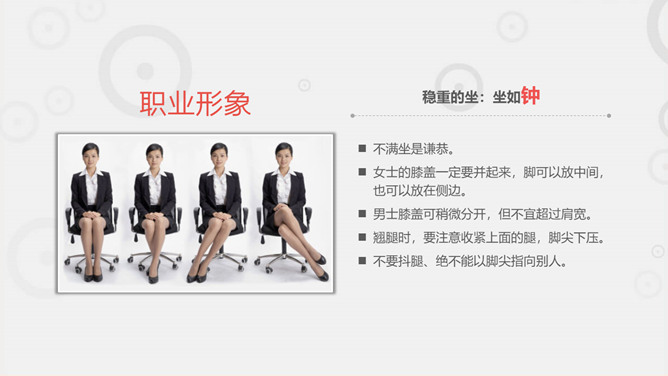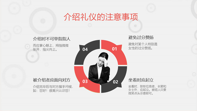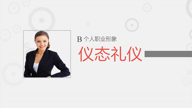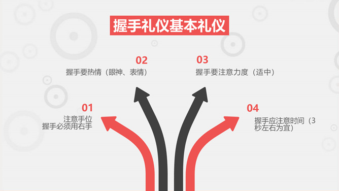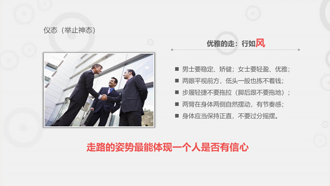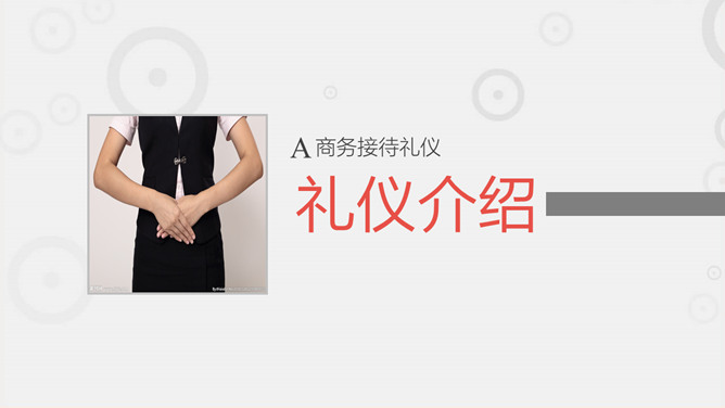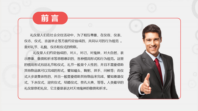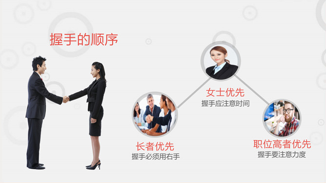 职场职业礼仪培训PPT模板。一套职业礼仪培训课件模板,包括礼仪基本介绍 ,握手迎客礼仪 ,会议拜访礼仪,仪表仪态礼仪等几个部分。