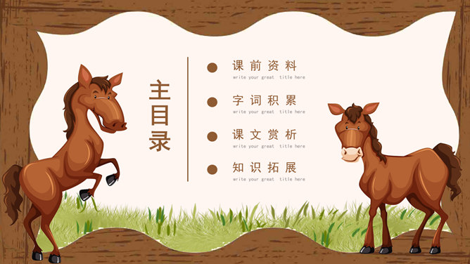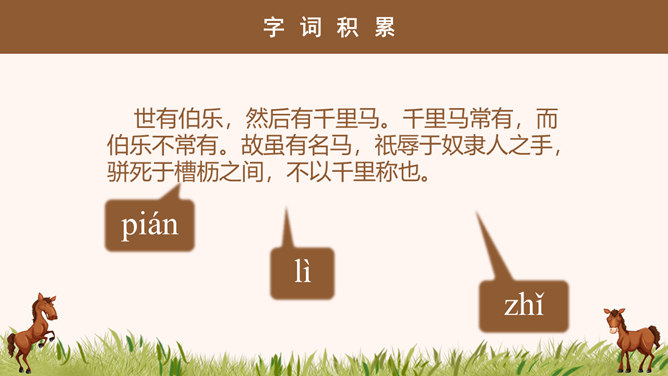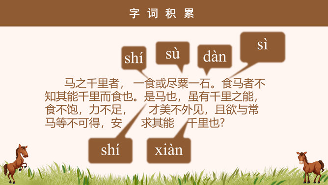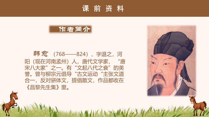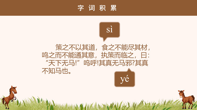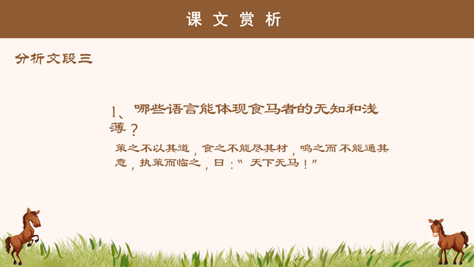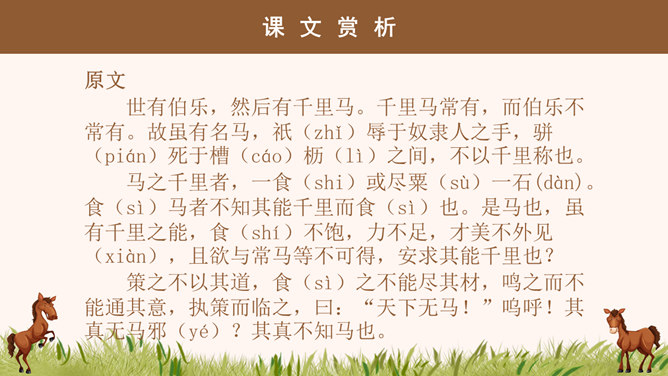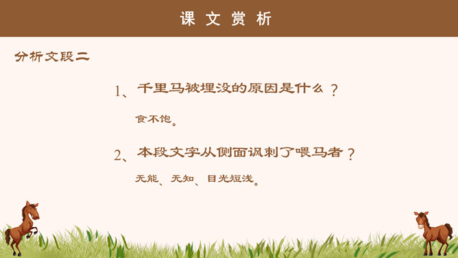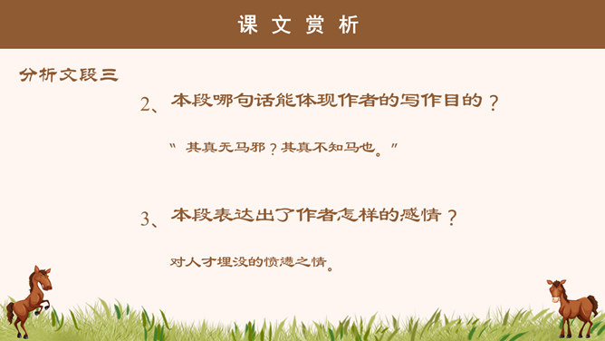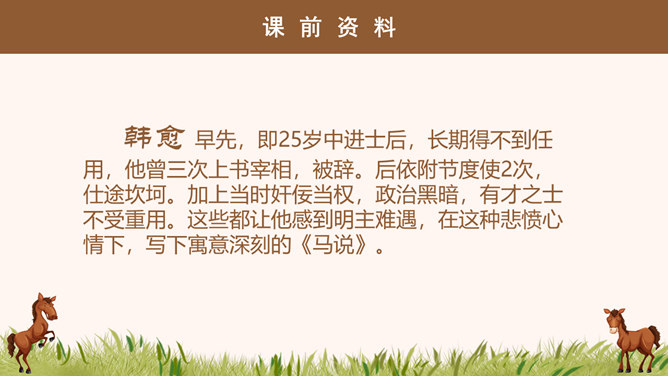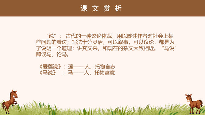 “说”: 古代的一种议论体裁,用以陈述作者对社会上某些问题的看法;写法十分灵活,可以叙事,可以议论,都是为了说明一个道理;讲究文采,和现在的杂文大致相近。“马说”即谈马、论马。《马说》是唐代文学家韩愈的一篇借物寓意的杂文,属论说文体。这篇文章以马为喻,谈的是人才问题,表达了作者对统治者不能识别人才、不重视人才、埋没人才的强烈愤慨。1、千里马被埋没的原因是什么? 食不饱。2、本段文字从侧面讽刺了喂马者?无能、无知、目光短浅。1、哪些语言能体现食马者的无知和浅薄?策之不以其道,食之不能尽其材,鸣之而 不能通其意,执策而临之,曰:“天下无马!”2、本段哪句话能体现作者的写作目的?“其真无马邪?其真不知马也。” 3、本段表达出了作者怎样的感情?对人才埋没的愤懑之情。所属专题:马说ppt。