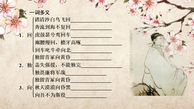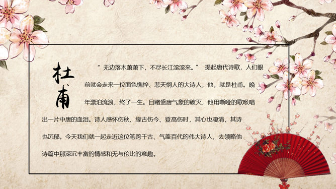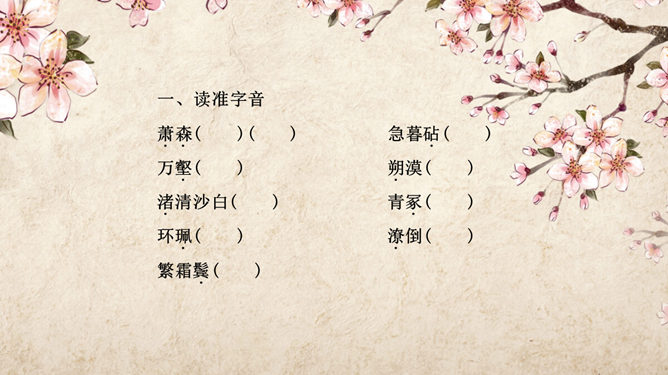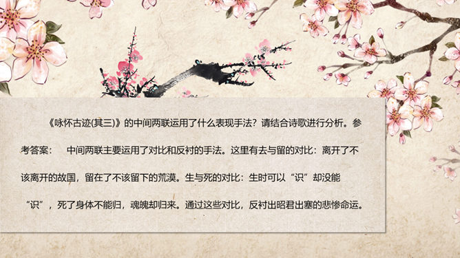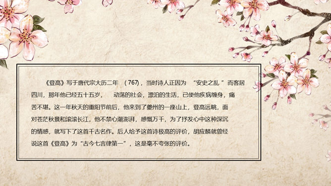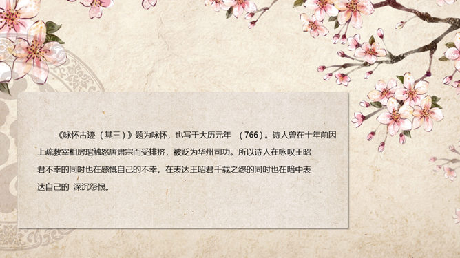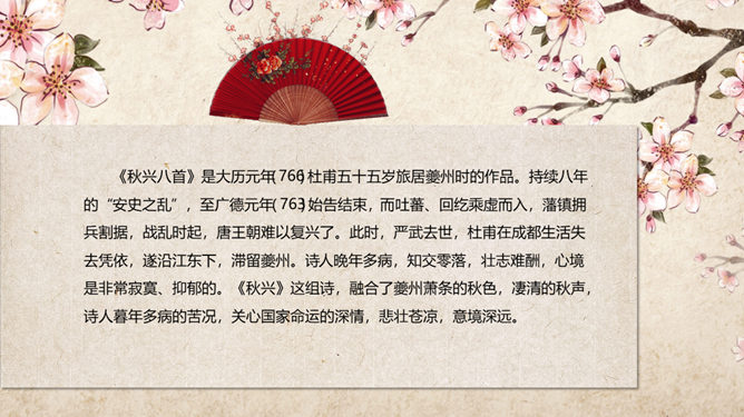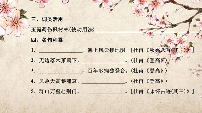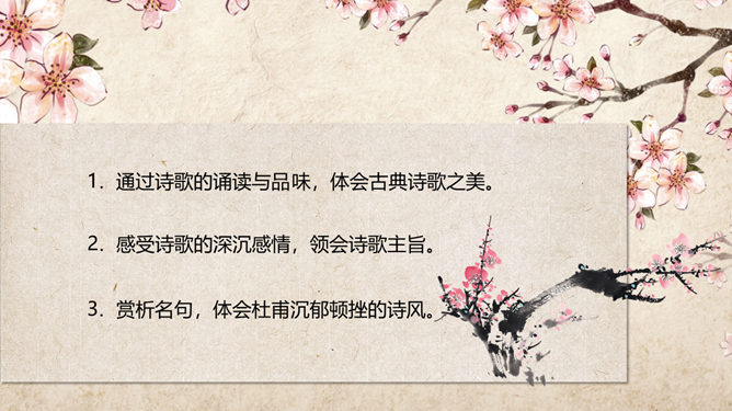 通过诗歌的诵读与品味,体会古典诗歌之美。感受诗歌的深沉感情,领会诗歌主旨。赏析名句,体会杜甫沉郁顿挫的诗风。《秋兴八首(其一)》是一篇随物兴感、即景寄怀之作。诗人通过对巫山、巫峡深秋景象的描绘,渲染了阴沉萧森、动乱不安的环境气氛,抒写了自己因离乱而常年流落他乡、不能东归中原的悲哀和对干戈不息、前途未卜的国家的担忧。《登高》通过重阳登高所见、所闻、所感,描绘了江边深渊空旷的景色,抒发了诗人常年漂泊、潦倒一生、老病孤愁的复杂情感。《咏怀古迹(其三)》是诗人经过昭君村时所作怀古伤己的咏史诗。诗人借咏王昭君不被帝遇、葬身塞外的不幸遭遇来抒写自己不被重用、身世漂泊的悲苦情怀。