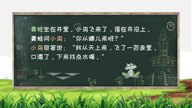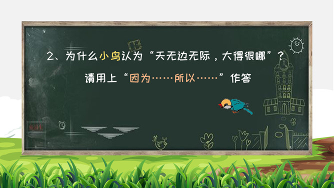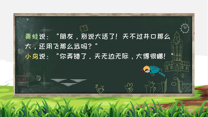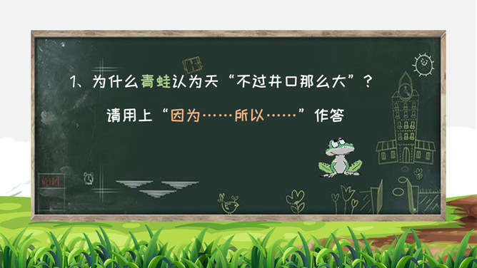 请同学们认真阅读课文!注意生字词!阅读思考,1、为什么青蛙认为天“不过井口那么大”?请用上“因为……所以……”作答。2、为什么小鸟认为“天无边无际,大得很哪”?请用上“因为……所以……”作答。自读第二至七自然段,用不同的符号,分别画出讲青蛙和小鸟对天的不同看法的句子。看图填空,青蛙坐在( ),小鸟落在( )。青蛙和小鸟为什么有不同的看法?围绕这个问题自由读课文,想想再回答。