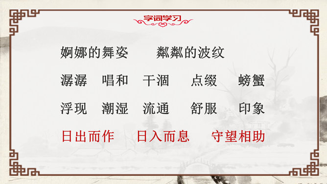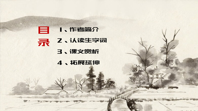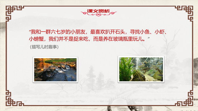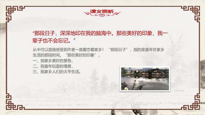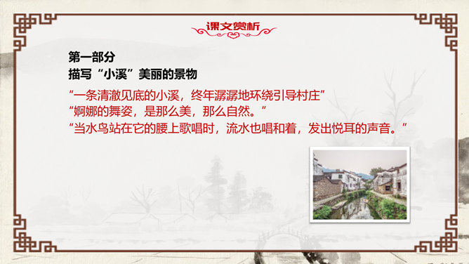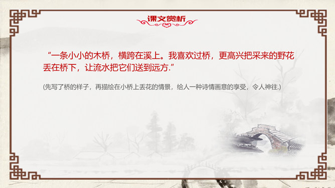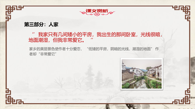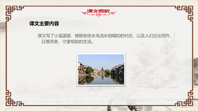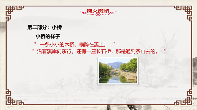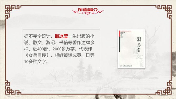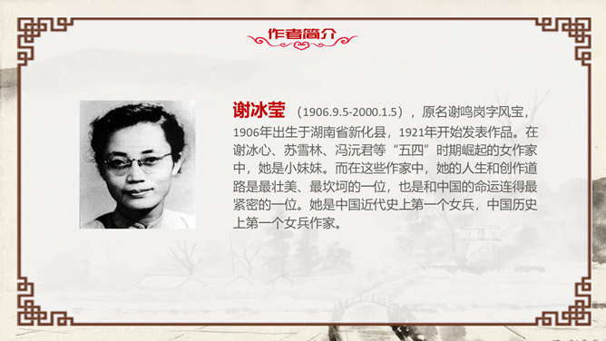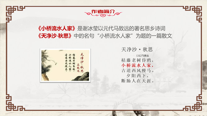 谢冰莹 (1906.9.5-2000.1.5),原名谢鸣岗字风宝,1906年出生于湖南省新化县,1921年开始发表作品。《小桥流水人家》是谢冰莹以元代马致远的著名思乡诗词《天净沙·秋思》中的名句“小桥流水人家”为题的一篇散文。课文主要内容,课文写了小溪潺潺、杨柳依依水鸟流水相唱和的村庄,以及人们日出而作,日落而息,守望相助的生活。课间问答,作者运用了哪些词汇来说明家乡的美呢?“那段日子,深深地印在我的脑海中。那些美好的印象,我一辈子也不会忘记。”是什么样的日子,为什么深深地印在我的脑海中? 同学们的脑海中,都拥有了属于自己的“小桥流水人家”,其实我们每一个人的家乡都是一幅美丽的画卷。说说自己的家乡。