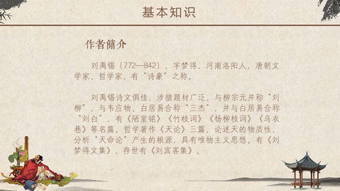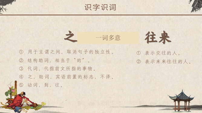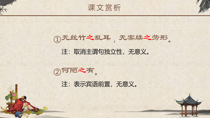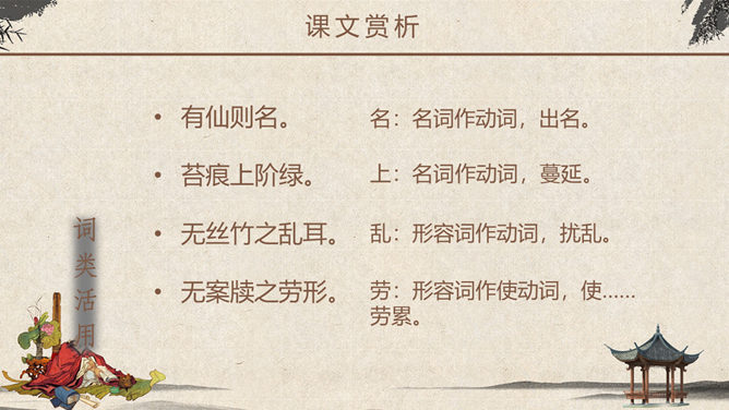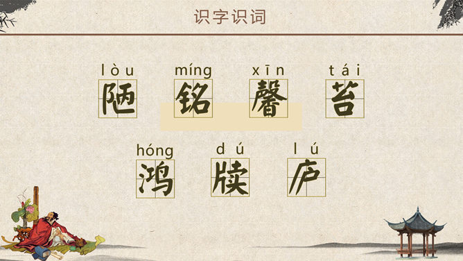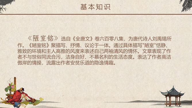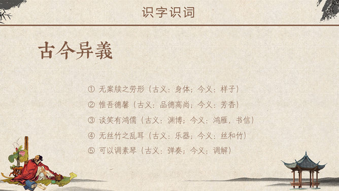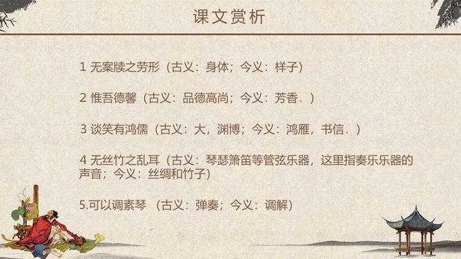 古今异义,无案牍之劳形(古义:身体;今义:样子)惟吾德馨(古义:品德高尚;今义:芳香)谈笑有鸿儒(古义:渊博;今义:鸿雁,书信)无丝竹之乱耳(古义:乐器;今义:丝和竹)可以调素琴(古义:弹奏;今义:调解)①表示交往的人 。例句:谈笑有鸿儒,往来无白丁 。②表示来来往往的人 。例句:其中往来种作(《桃花源记》)作者通过描写自己的“陋室”表明自己高洁傲岸的节操和安贫乐道的情趣 。你觉得下面的学生铭反映的是何种学习态度?你对这样的学生是如何看待的?分不在高,及格就行; 学不在深,作弊则灵。斯是教室,唯我闲情。小说传得快,杂志翻得勤。琢磨打篮球,寻思游戏厅,可以打瞌睡,观窗景。所属专题:陋室铭ppt。