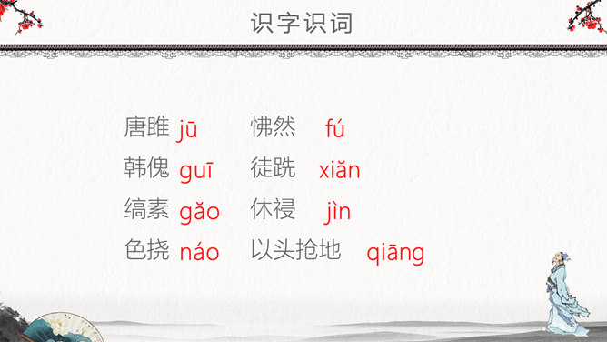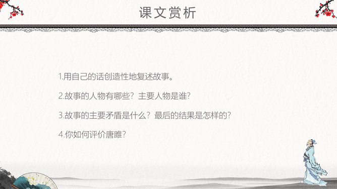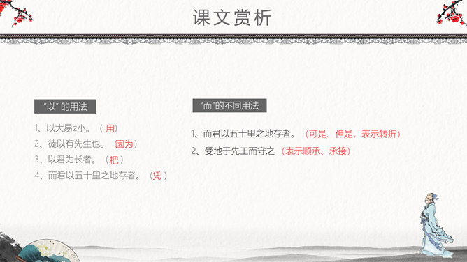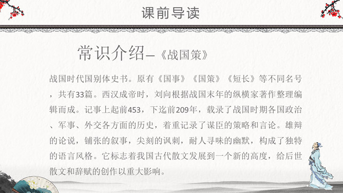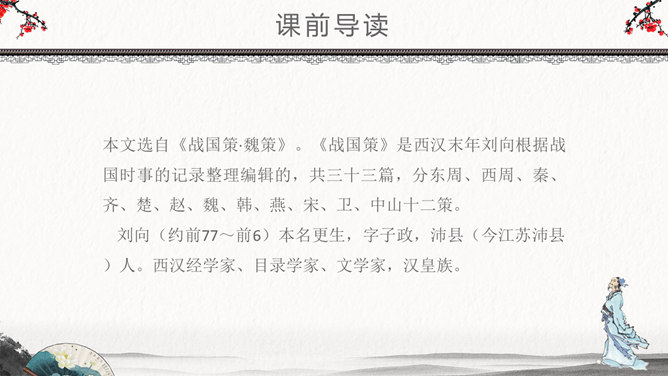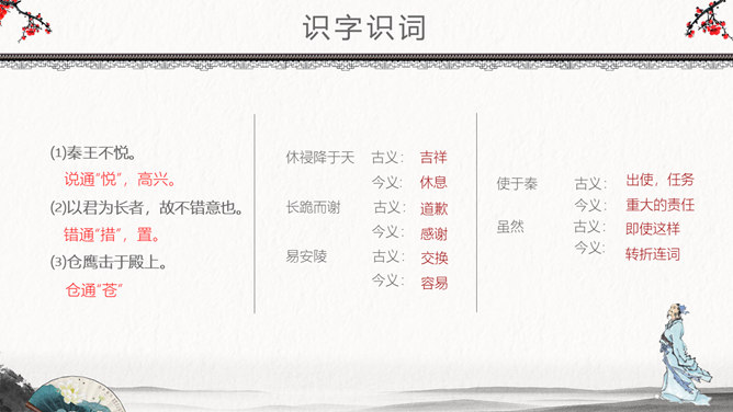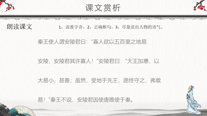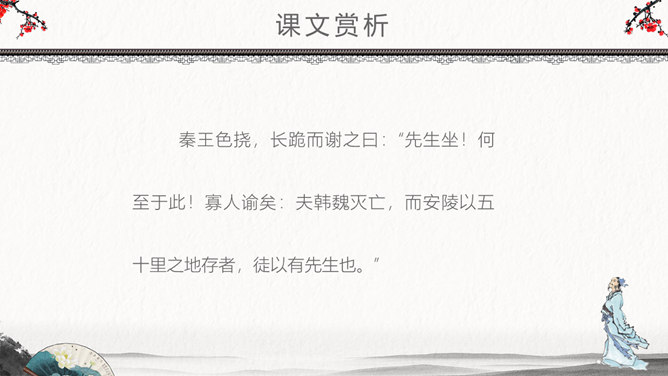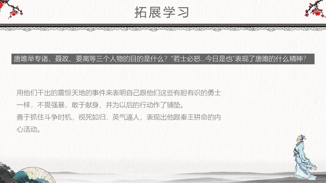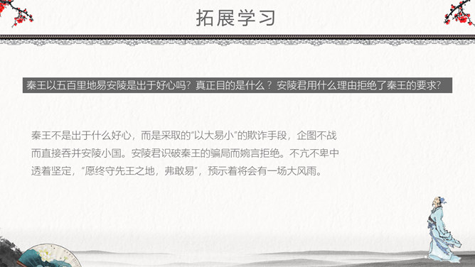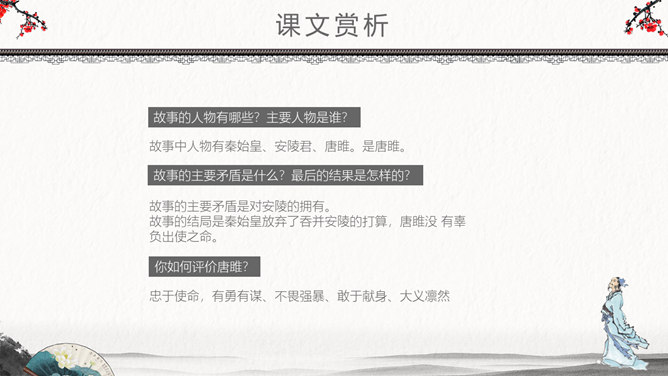 秦王以五百里地易安陵是出于好心吗?真正目的是什么 ?安陵君用什么理由拒绝了秦王的要求?王不是出于什么好心,而是采取的“以大易小”的欺诈手段,企图不战而直接吞并安陵小国。安陵君识破秦王的骗局而婉言拒绝。不亢不卑中透着坚定,“愿终守先王之地,弗敢易”,预示着将会有一场大风雨。唐雎举专诸、聂政、要离等三个人物的目的是什么?“若士必怒…今日是也”表现了唐雎的什么精神?用他们干出的震惊天地的事件来表明自己跟他们这些有胆有识的勇士一样,不畏强暴,敢于献身,并为以后的行动作了铺垫。善于抓住斗争时机,视死如归,英气逼人,表现出他跟秦王拼命的内心活动。秦王长跪而谢之,写出了秦王的什么心态?神色木然而道歉(色挠,长跪而谢);欺软怕硬、内心虚弱、卑躬屈膝,色厉内荏、前倨后恭。如何刻画人物?1、通过人物的语言、神态、动作来刻画人物形象,其中最突出的是语言。2、通过对比来刻画人物形象。所属专题:唐雎不辱使命ppt。