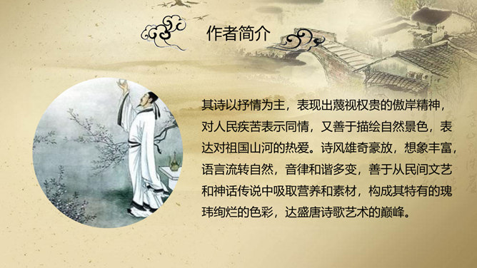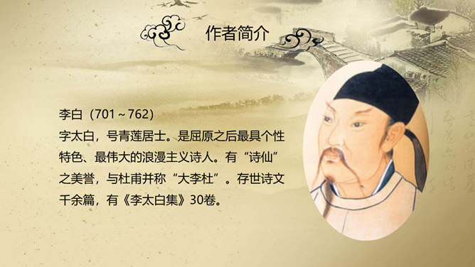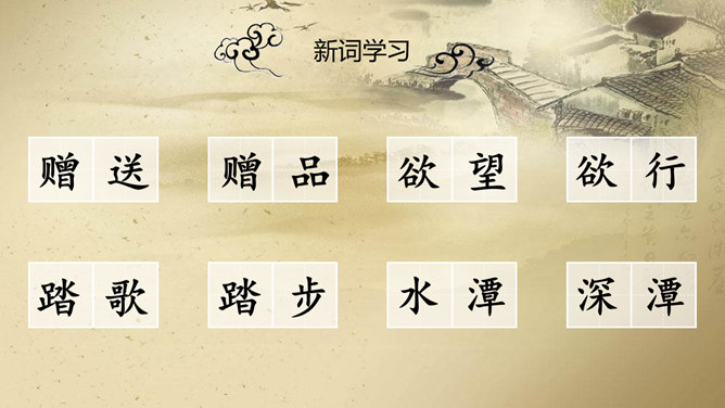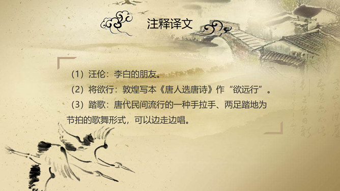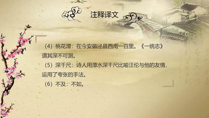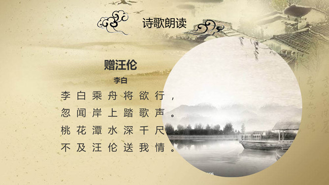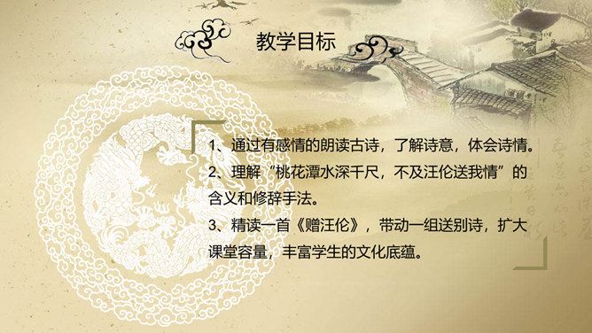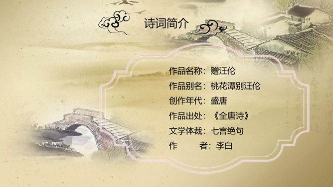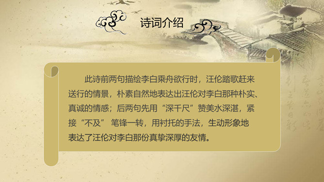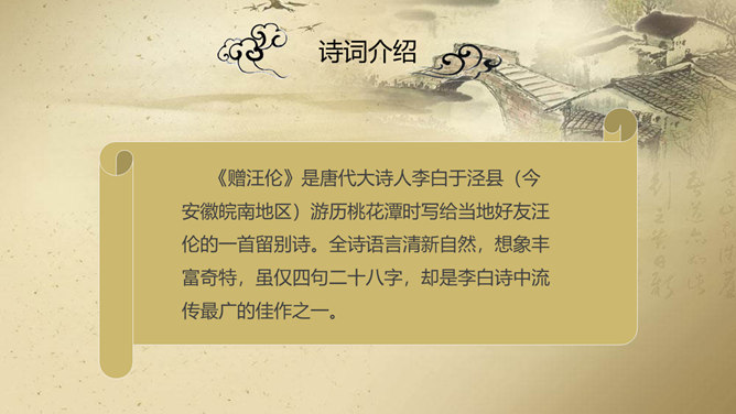 教学目标:1、通过有感情的朗读古诗,了解诗意,体会诗情。2、理解“桃花潭水深千尺,不及汪伦送我情”的含义和修辞手法。3、精读一首《赠汪伦》,带动一组送别诗,扩大课堂容量,丰富学生的文化底蕴。《赠汪伦》是唐代大诗人李白于泾县(今安徽皖南地区)游历桃花潭时写给当地好友汪伦的一首留别诗。全诗语言清新自然,想象丰富奇特,虽仅四句二十八字,却是李白诗中流传最广的佳作之一。此诗前两句描绘李白乘舟欲行时,汪伦踏歌赶来送行的情景,朴素自然地表达出汪伦对李白那种朴实、真诚的情感;后两句先用“深千尺”赞美水深湛,紧接“不及” 笔锋一转,用衬托的手法,生动形象地表达了汪伦对李白那份真挚深厚的友情。有感性的朗读、背诵古诗,并练习默写。把李白和汪伦的故事讲给家人听。课外学习一首朋友依依惜别的诗或文章,抽时间与同学交流。