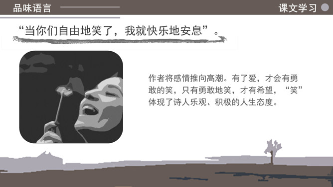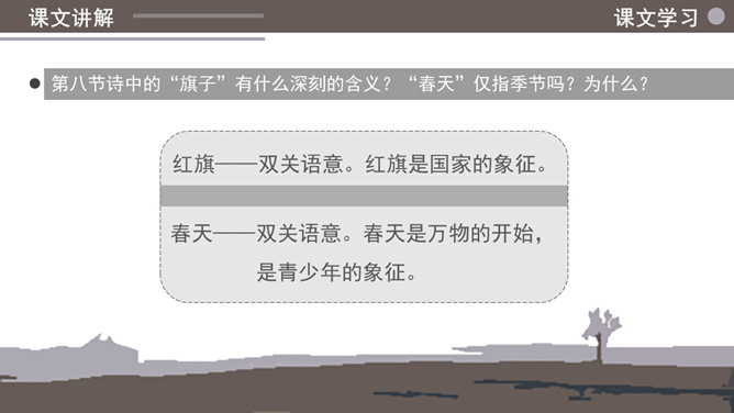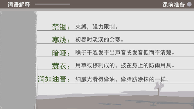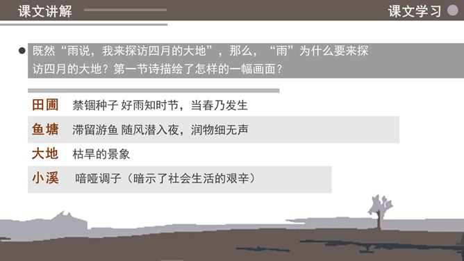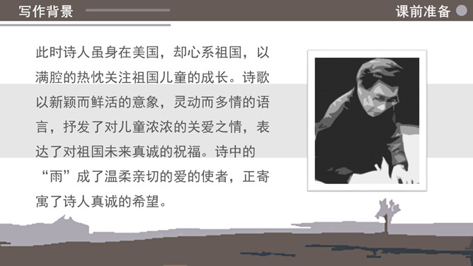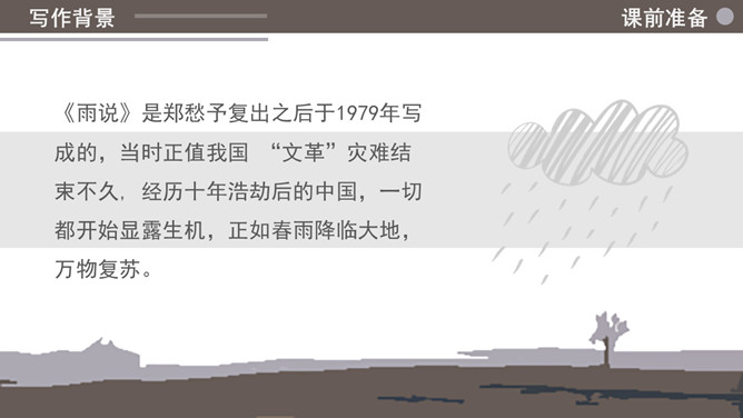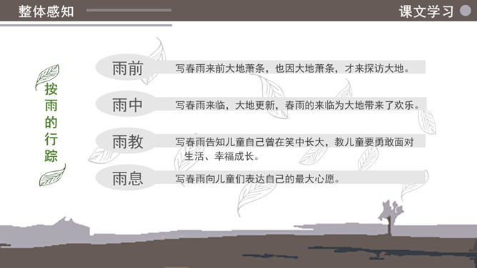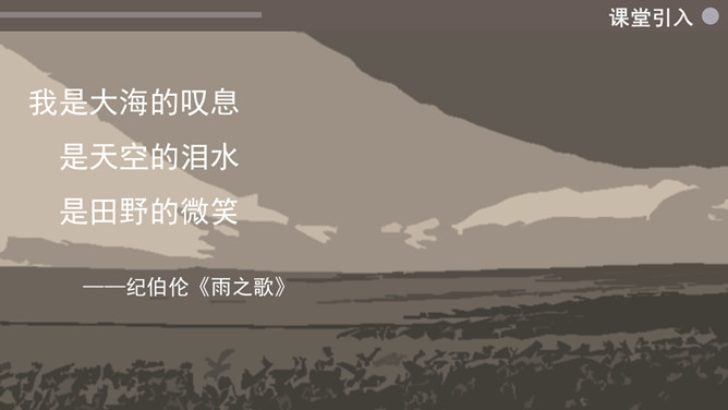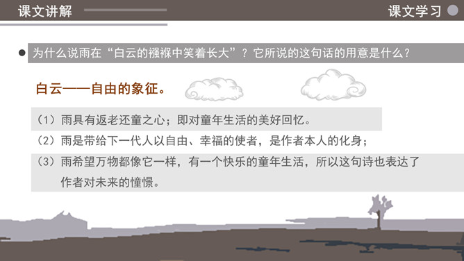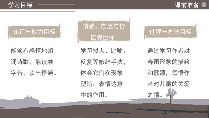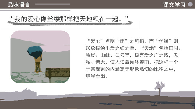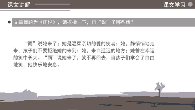 情感、态度与价值观目标:学习拟人、比喻、反复等修辞手法,体会它们在形象塑造、表情达意中的作用。知识与能力目标 :能够有感情地朗诵诗歌,能读准字音,读出停顿。过程与方法目标:通过学习作者对春雨形象的描绘和歌颂,领悟作者对儿童的关爱之情。文章标题为《雨说》,请概括一下,雨“说”了哪些话?“雨”说她来了;她是温柔亲切的爱的使者;她,静悄悄地走来,孩子们不要拒绝她的来到;她,来自遥远的地方;她曾在幸运的笑中长大。“雨”说她来了,就不再回去,当孩子们学会了自由地笑,她快乐地安息。“我的爱心像丝缕那样把天地织在一起。” “爱心”点明“雨”之所指,而“丝缕”则形象描绘出爱之细之柔,“天地”包括田园、牧场、山峰、白云等,极言爱之广之浓,无私、博大,使人读后如沐春雨。把这样一个丰富深刻的内涵寓于形象贴切的比喻之中,境界全出。作者将感情推向高潮。有了爱,才会有勇敢的笑,只有勇敢地笑,才有希望,“笑”体现了诗人乐观、积极的人生态度。
