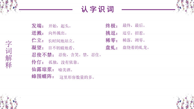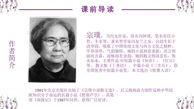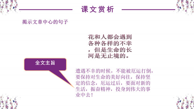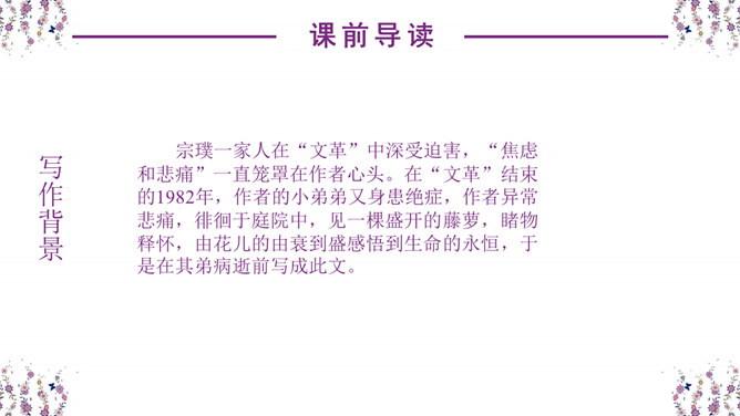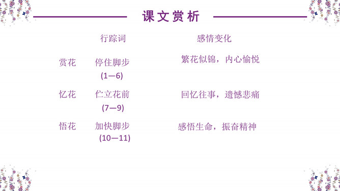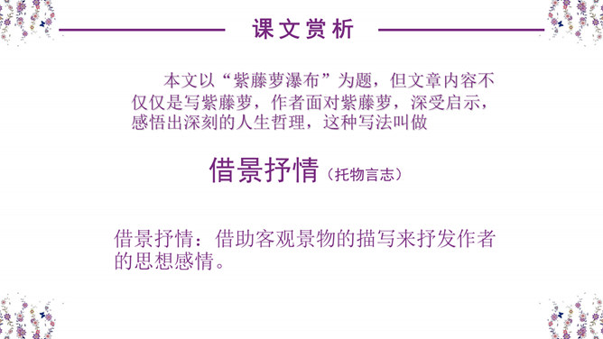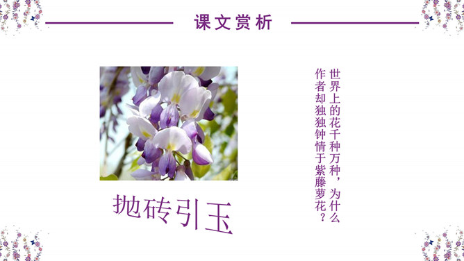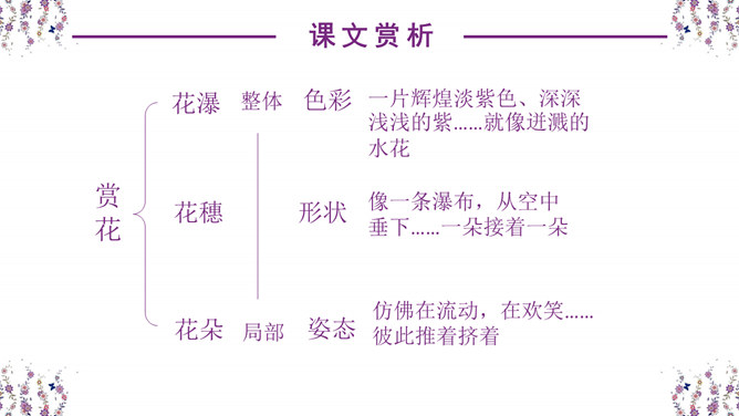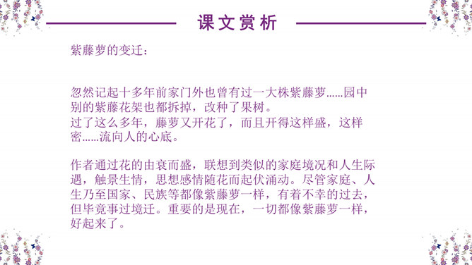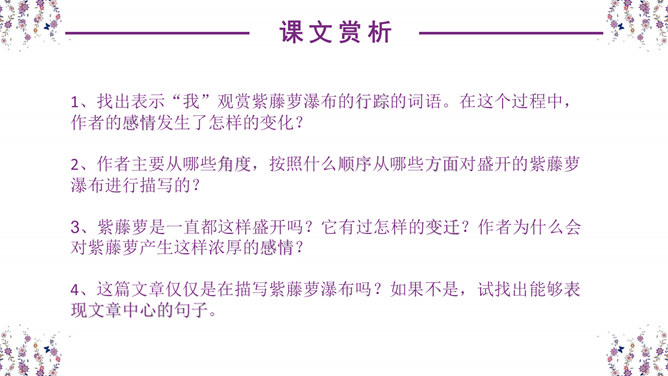 1、找出表示“我”观赏紫藤萝瀑布的行踪的词语。在这个过程中,作者的感情发生了怎样的变化?2、作者主要从哪些角度,按照什么顺序从哪些方面对盛开的紫藤萝瀑布进行描写的?3、紫藤萝是一直都这样盛开吗?它有过怎样的变迁?作者为什么会对紫藤萝产生这样浓厚的感情?4、这篇文章仅仅是在描写紫藤萝瀑布吗?如果不是,试找出能够表现文章中心的句子。本文通过回忆紫藤萝的败落,隐喻家庭遭受的不幸以及小弟病症带来的焦虑、悲痛;借写紫藤萝开放时的美景,赞美生命的顽强和美好,托用花儿抒发我的人生感悟,寓情于物,情景交融。文章开头说“我不由得停住了脚步”,结尾说“我不觉加快了脚步”它们各有什么含义?作用是什么?“停住了脚步”是指被紫藤萝的旺盛所吸引。设置悬念。“加快了脚步”是被紫藤萝的生命活力所感染,并转化为前进的动力。照应开头,使结构完整,深化主题。所属专题:紫藤萝瀑布ppt。