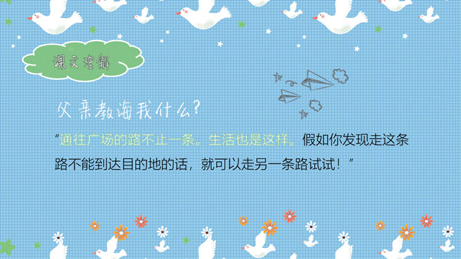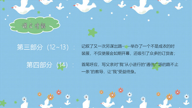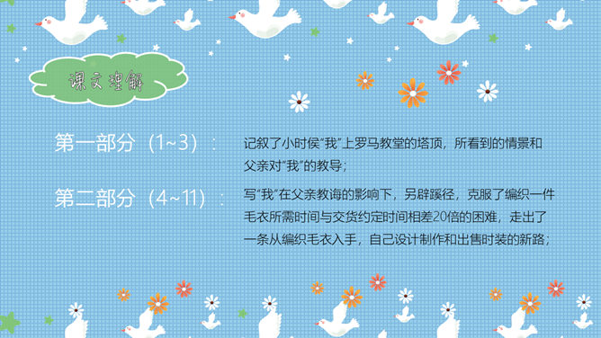 有感情地朗读课文,并背诵自己喜欢的自然段。读课文,想想你怎样分段?第一部分(1~3):记叙了小时侯“我”上罗马教堂的塔顶,所看到的情景和父亲对“我”的教导;第二部分(4~11)写“我”在父亲教诲的影响下,另辟蹊径,克服了编织一件毛衣所需时间与交货约定时间相差20倍的困难,走出了一条从编织毛衣入手,自己设计制作和出售时装的新路;第三部分(12~13):记叙了又一次另谋出路——举办了一个不是成衣的时装展,不仅使展会如期开幕,还吸引了众多的订货者;第四部分(14):首尾呼应,写父亲对“我”从小进行的“通往广场的路不止一条”的教导,让“我”受益终身。 课文主要讲了什么?本文记述了"我"在人生的道路上深陷困境、从父亲的教诲中得到了走另外一条路的灵感和勇气,从而获得成功的事情。我遇到了什么困难?是怎样克服的?结合生活实际体会“通往广场的路不止一条”的含义?(你在生活中有过类似的问题吗?你是如何解决的。请说一说。)