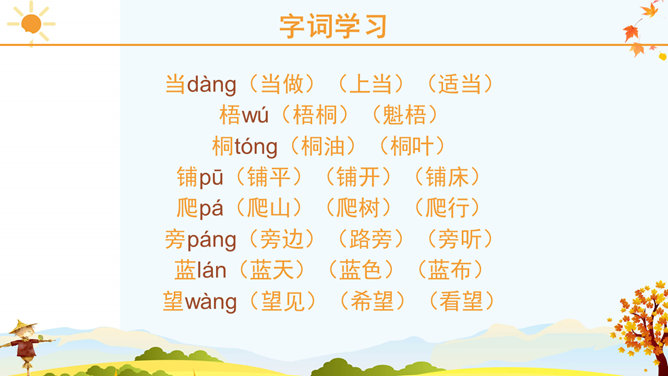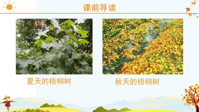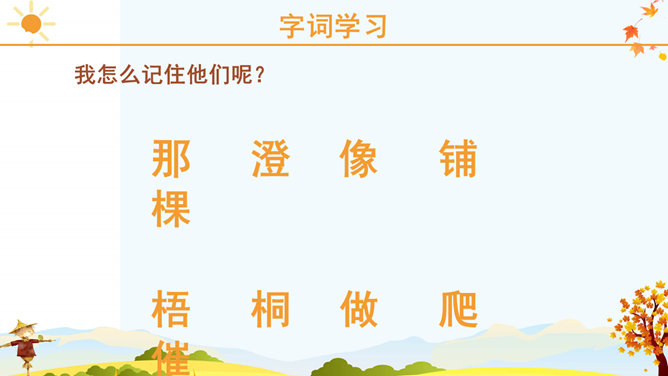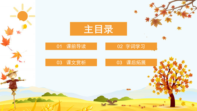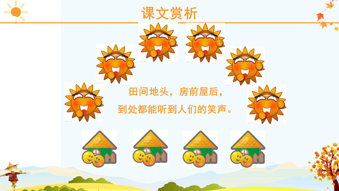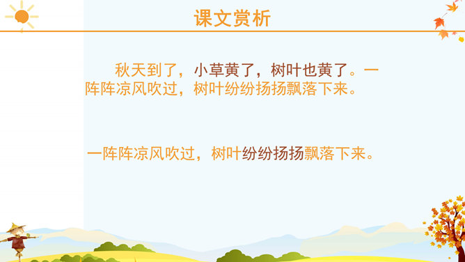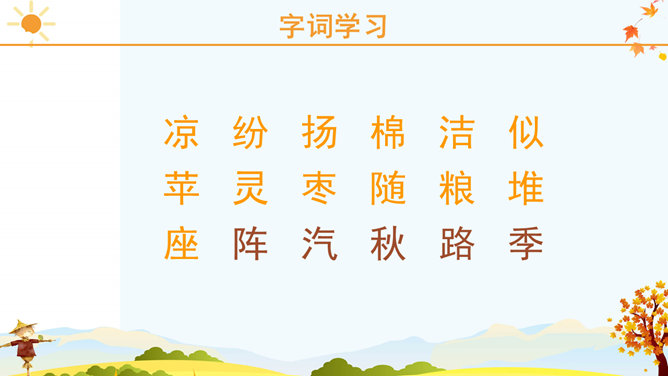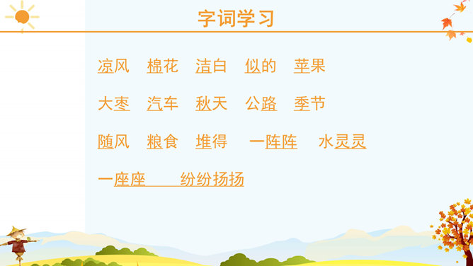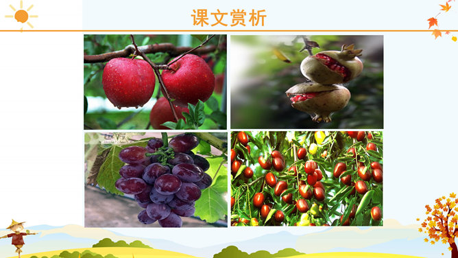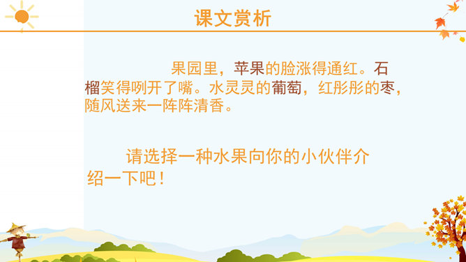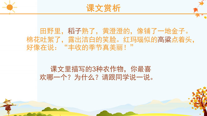 课文里描写的3种农作物,你最喜欢哪一个?为什么?请跟同学说一说。稻子熟了,黄澄澄的,像铺了一地金子。月亮弯弯的,像小船。秋天到了,小草黄了,树叶也黄了。一阵阵凉风吹过,树叶纷纷扬扬飘落下来。一阵阵凉风吹过,树叶纷纷扬扬飘落下来。田野里,稻子熟了,黄澄澄的,像铺了一地金子。棉花吐絮了,露出洁白的笑脸。红玛瑙似的高粱点着头,好像在说:“丰收的季节真美丽!”果园里,苹果的脸涨得通红。石榴笑得咧开了嘴。水灵灵的葡萄,红彤彤的枣,随风送来一阵阵清香。请选择一种水果向你的小伙伴介绍一下吧! 请用行动表达出对秋天的喜爱。画一幅美丽的秋景图。