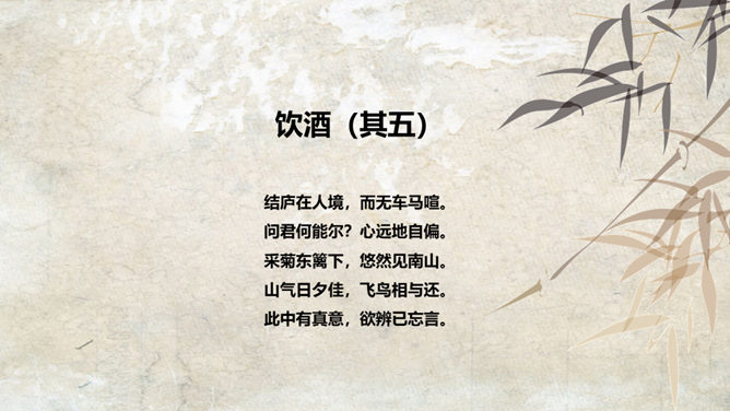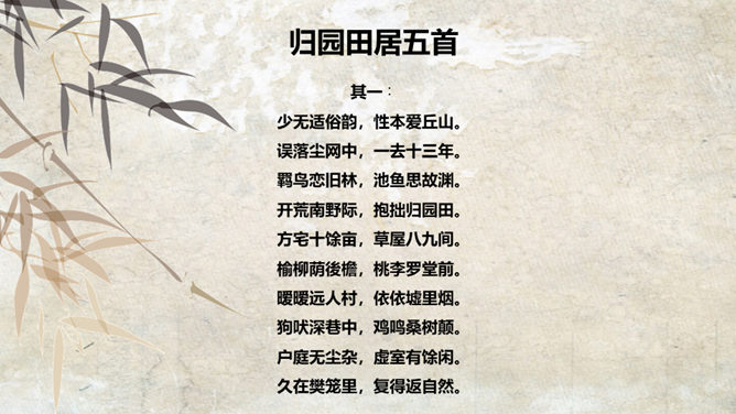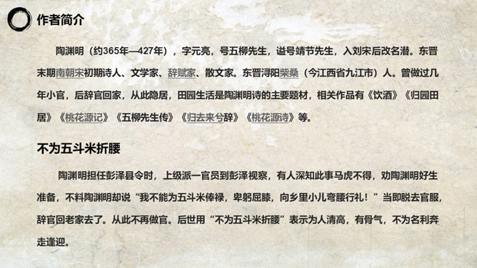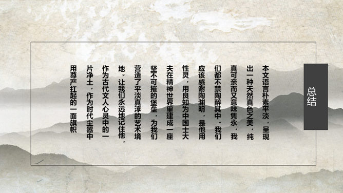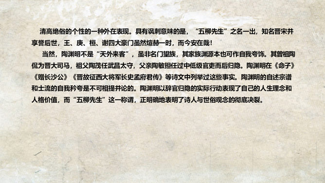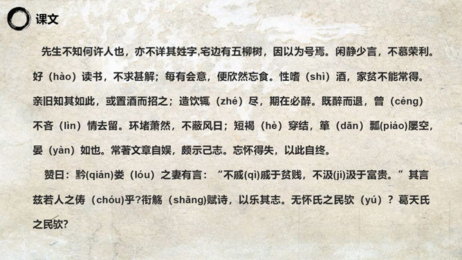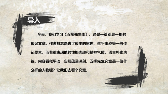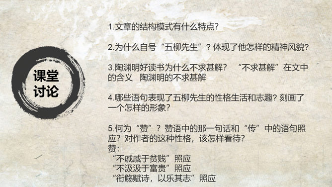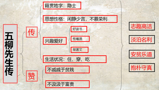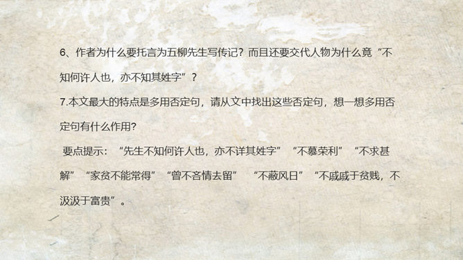 今天,我们学习《五柳先生传》。这是一篇别具一格的传记文章。作者故意隐去了传主的家世、生平事迹等一般传记要素,而着重表现他的性格志趣和精神气质。语言朴素洗练,内容看似平淡,实则蕴涵深刻。五柳先生究竟是一位什么样的人物呢?让我们去看个究竟。1.文章的结构模式有什么特点?2.为什么自号“五柳先生”? 体现了他怎样的精神风貌?3.陶渊明好读书为什么不求甚解? “不求甚解”在文中的含义 陶渊明的不求甚解。4.哪些语句表现了五柳先生的性格生活和志趣? 刻画了一个怎样的形象?5.何为“赞”?赞语中的那一句话和“传”中的语句照应?对作者的这种性格,该怎样看待? 赞:“不戚戚于贫贱”照应“不汲汲于富贵”照应“衔觞赋诗,以乐其志”照应。6、作者为什么要托言为五柳先生写传记?而且还要交代人物为什么竟“不知何许人也,亦不知其姓字”? 7.本文最大的特点是多用否定句,请从文中找出这些否定句,想一想多用否定句有什么作用? 要点提示:“先生不知何许人也,亦不详其姓字”“不慕荣利”“不求甚解”“家贫不能常得”“曾不吝情去留” “不蔽风日”“不戚戚于贫贱,不汲汲于富贵”。