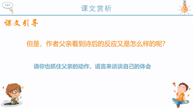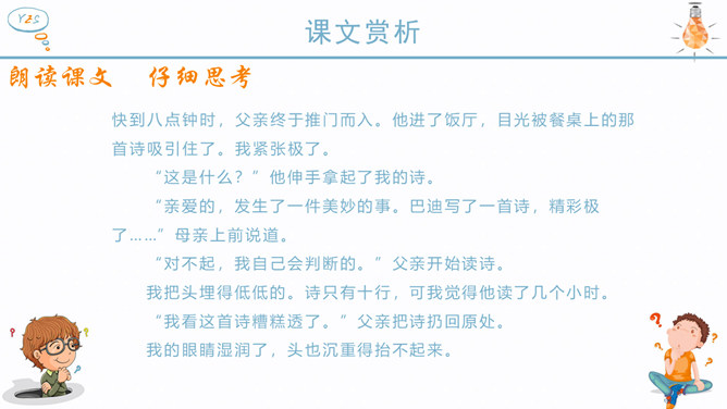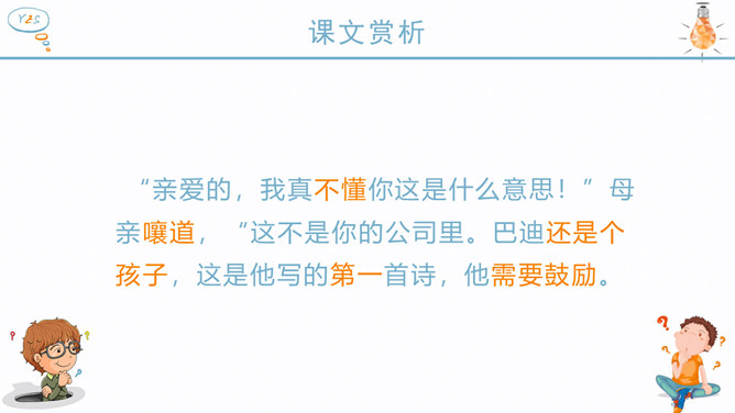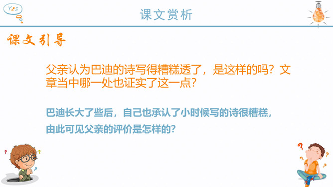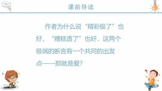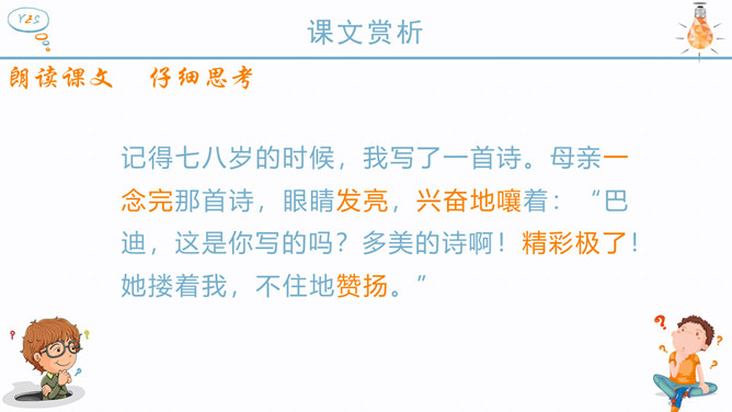 作者为什么说“精彩极了”也好,“糟糕透了”也好,这两个极端的断言有一个共同的出发点——那就是爱? 可想而知,巴迪此时对自己的诗是多么自信,他以为父亲回来看到他的诗,一定也会大加赞扬。现在请同学们想一想,如果巴迪的父亲回家看了巴迪的诗后和母亲的反应是一样的,也是赞不绝口,这样会对作者产生什么样的影响?但是,作者父亲看到诗后的反应又是怎么样的呢?请你也抓住父亲的动作、语言来谈谈自己的体会。父亲认为巴迪的诗写得糟糕透了,是这样的吗?文章当中哪一处也证实了这一点?巴迪长大了些后,自己也承认了小时候写的诗很糟糕,由此可见父亲的评价是怎样的?但是面对父亲这样的评价,我的反应如何?两种不同的评价,带给孩子的感受是截然不同的。现在,你能说说为什么父亲和母亲对巴迪的诗会有不同的看法吗?