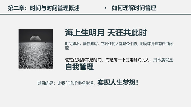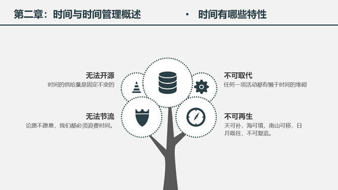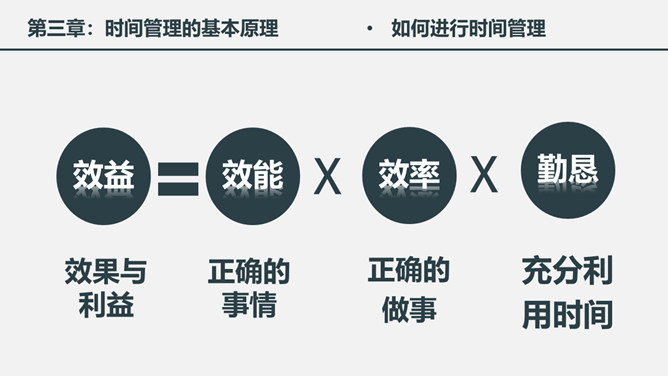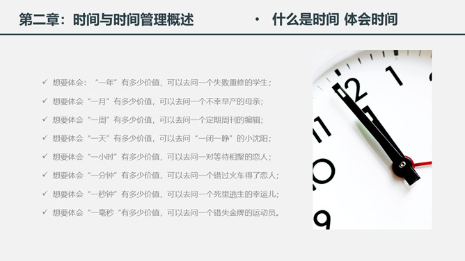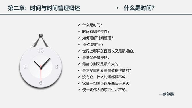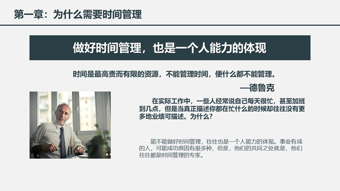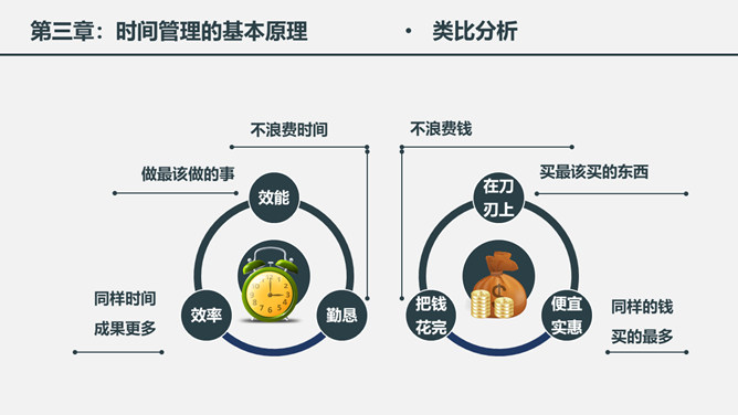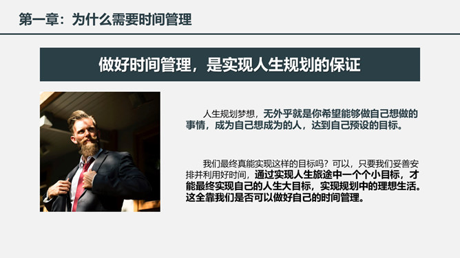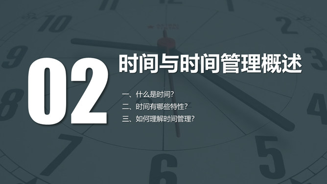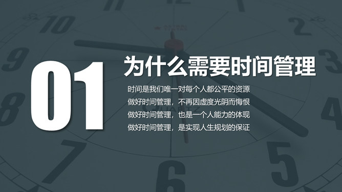 时间管理培训课件PPT模板。一套时间管理培训幻灯片课件模板,简洁大气实用,包括为什么需要时间管理、时间与时间管理概述、时间管理的基本原理、时间管理的具体实施几个部分。