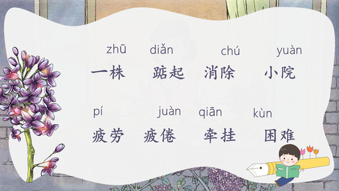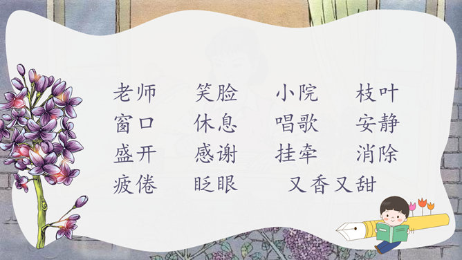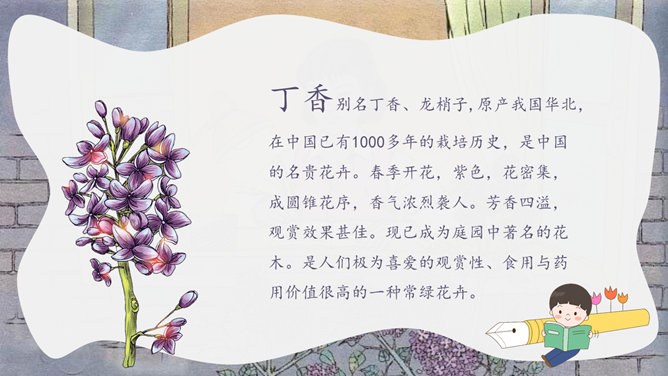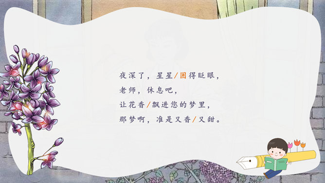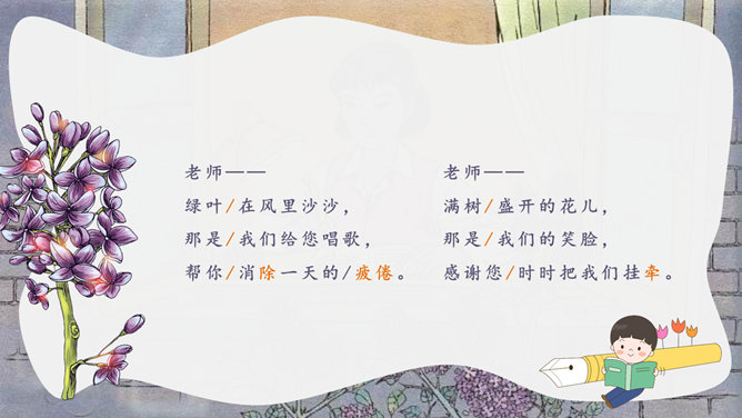 丁香别名丁香、龙梢子,原产我国华北,在中国已有1000多年的栽培历史,是中国的名贵花卉。想一想,同学们为什么把紫丁香栽在老师窗前?这株紫丁香是谁种的?“我们”是怎样走进小院的?为什么要“踮起脚尖儿”?我读懂了,他们栽下一株紫丁香,为的是让绿 色的枝叶夜夜(和老师做伴);是让沙沙的绿叶儿声帮老师(解除一天的疲倦);让满树盛开的小花感谢老师(时时把我们牵挂 );让花香飘进老师( 又香又甜 )梦里。还有哪些赞美老师的诗句呢。1.春蚕到死丝方尽, 蜡炬成灰泪始干。2.教师的春风,日日沐我心。3.一位好老师,胜过万卷书。4.您像一支红烛,为后辈献出了所有的热和光!5.一日为师,终身为父。6.园丁,崇高的称号,祝您桃李满天下,春晖遍四方。
