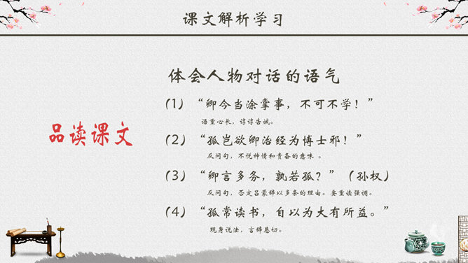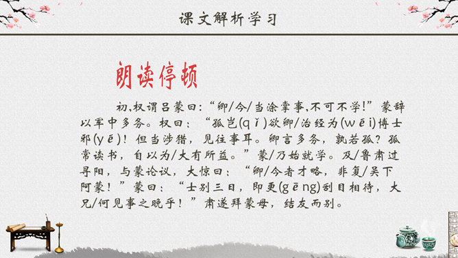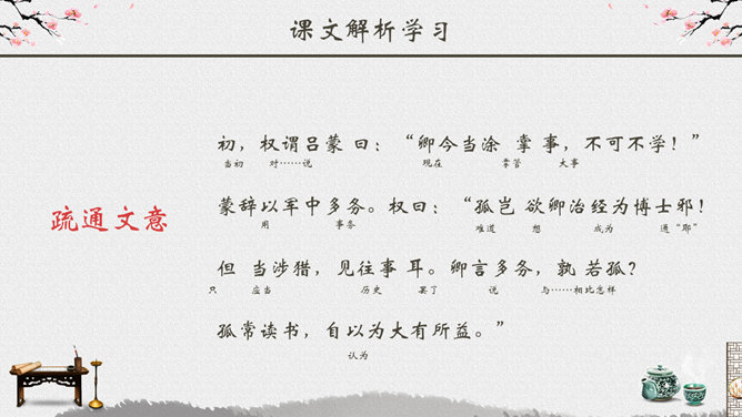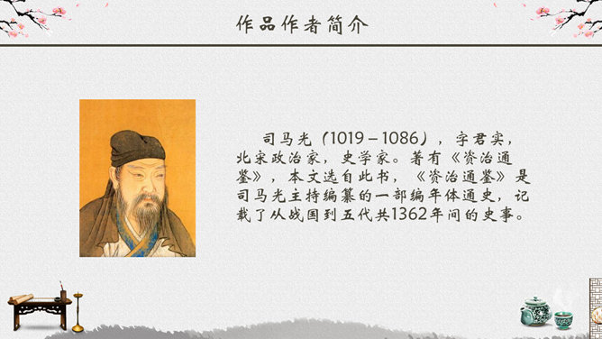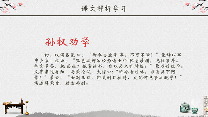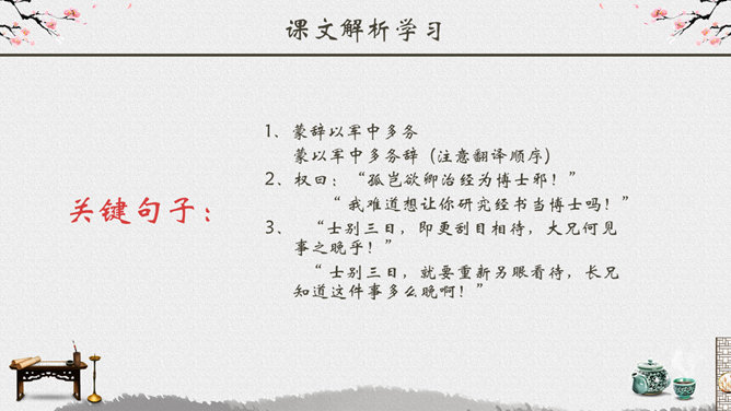 司马光(1019-1086),字君实,北宋政治家,史学家。著有《资治通鉴》,本文选自此书。成语学习与运用:“吴下阿蒙”原指三国时期吴国大将吕蒙。意思是说人没有学问的意思。现在多用在他人有了转变方面,凡学识大进,或地位从低下而攀高了,以及穷困而至富有了,都可以用此语。你还不知道吗?小王通过学习,已经掌握了两门外语,可不再是当年的吴下阿蒙了。文章主旨:本文通过孙权劝告吕蒙读书,吕蒙读书后大有长进的故事,告诉我们"开卷有益"的道理。 延伸训练:假如咱们班有一名同学产生厌学情绪,你是他(她)的好朋友,你该怎么办?学过本文之后,吕蒙的变化对你有什么启示?所属专题:孙权劝学ppt。