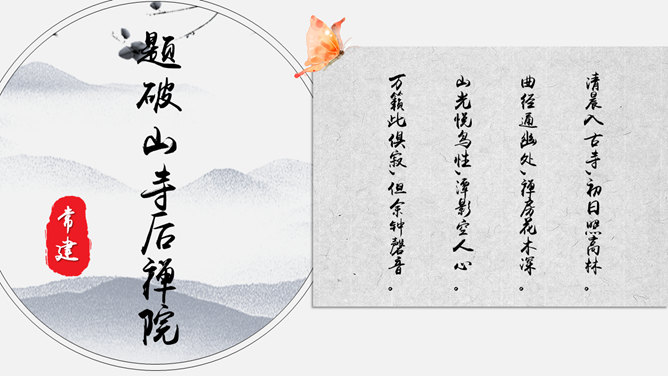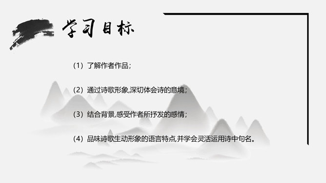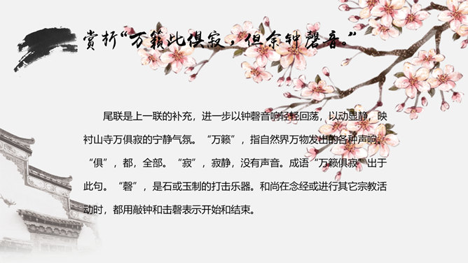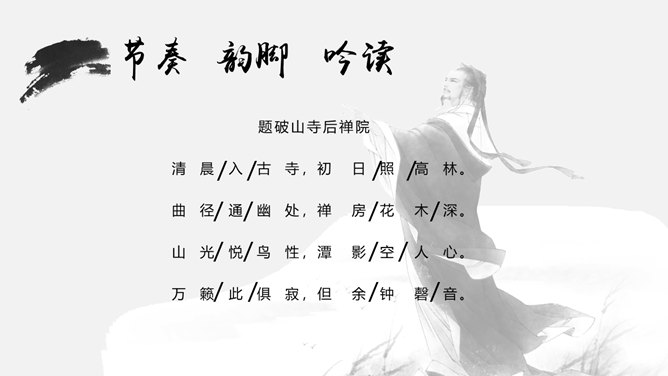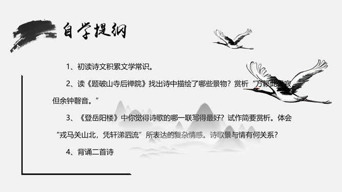 学习目标:(1)了解作者作品;(2)通过诗歌形象,深切体会诗的意境;(3)结合背景,感受作者所抒发的感情;(4)品味诗歌生动形象的语言特点,并学会灵活运用诗中句名。自学提纲: 1、初读诗文积累文学常识。2、读《题破山寺后禅院》找出诗中描绘了哪些景物?赏析“万籁此俱寂,但余钟磬音。”3、《登岳阳楼》中你觉得诗歌的哪一联写得最好?试作简要赏析。体会“戎马关山北,凭轩涕泗流”所表达的复杂情感。诗歌景与情有何关系?4、背诵二首诗。尾联是上一联的补充,进一步以钟磬音响轻轻回荡,以动显静,映衬山寺万俱寂的宁静气氛。“万籁”,指自然界万物发出的各种声响。“俱”,都,全部。“寂”,寂静,没有声音。这首诗题咏的是佛寺禅院,抒发的是作者忘却世俗、寄情山水的隐逸胸怀。诗人在清晨登破山,入兴福寺,旭日初升,光照山上树林。佛家称僧徒聚集的处所为“丛林”,所以“高林”兼有称颂禅院之意,在光照山林的景象中显露着礼赞佛宇之情。所属专题:题破山寺后禅院ppt。