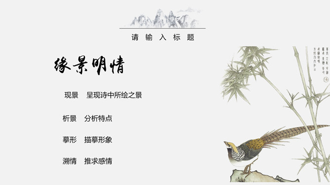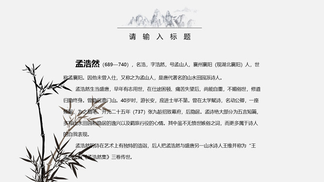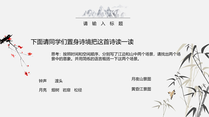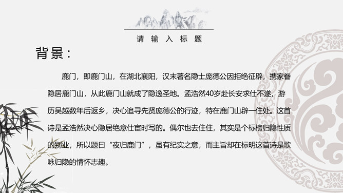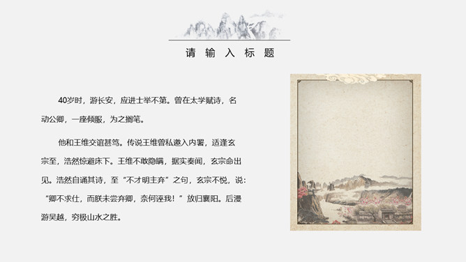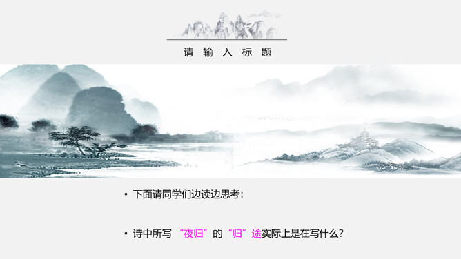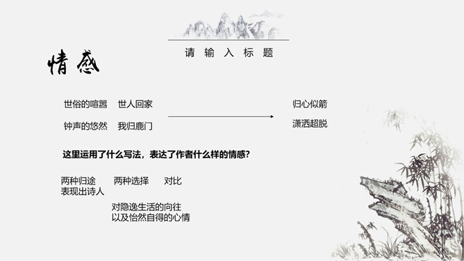 诗中所写:从日落黄昏到月悬夜空,从汉江舟行到鹿门山途。实质上是:从尘杂世俗到寂寥隐逸的道路。把握诗歌的意境: 诗中首先描绘了江边傍晚山寺不时传来悠然的钟声,渡口人们抢渡回家的喧闹的动态景象。诗人在船头凝望沉思——一叶扁舟飘然归向鹿门。接着又描绘了一幅朦胧的山树在皎洁的月光照耀下,显得格外美妙。而岩穴的山门和松间的小路也显得格外寂寥的静态景象,诗人陶醉了。整首诗表达了诗人的情感。营造出的意境。 请同学们按照置身诗境,缘景明情的基本思路赏析王维的《归嵩山作》。王维是盛唐山水田园诗派代表诗人之一。与孟浩然齐名,世称“王孟”。他多才多艺,诗歌之外,兼善散文、音乐、书法、绘画,尤以绘画见长,被推为“南宗”山水画之祖。苏轼也曾说:“味摩诘之诗,诗中有画;观摩诘之画,画中有诗。”官至尚书右丞,故世称王右丞。有《王右丞集》。
