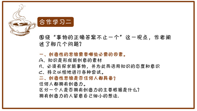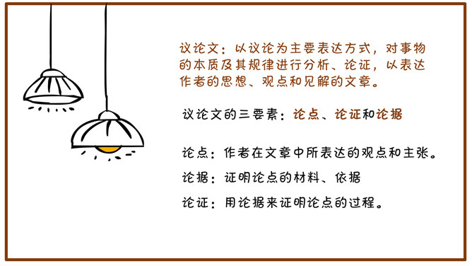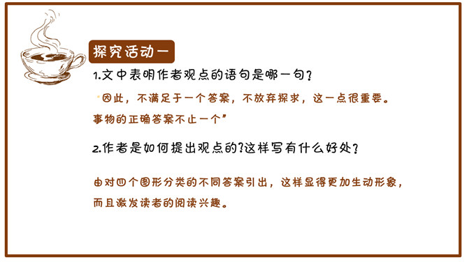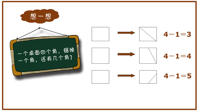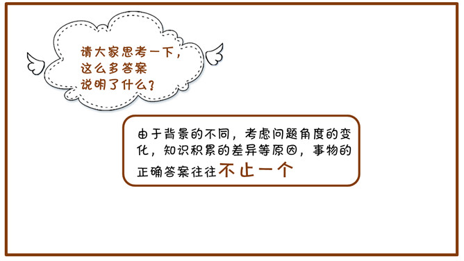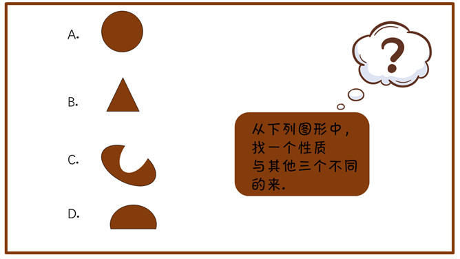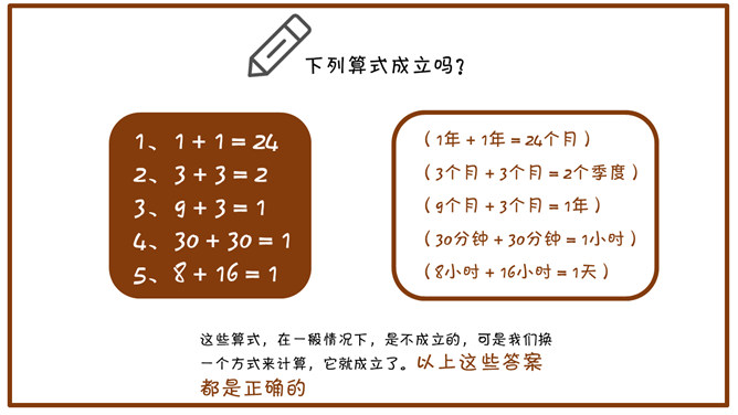 小游戏:请同学们计算下面两道题。1月+2月=1季度,8小时+16小时=1天。想一想:一个桌面四个角,锯掉一个角,还有几个角?1、1+1=24,2、3+3=2,3、9+3=1,4、30+30=1,5、8+16=1。(1年+1年=24个月)(3个月+3个月=2个季度)(9个月+3个月=1年)(30分钟+30分钟=1小时)(8小时+16小时=1天)这些算式,在一般情况下,是不成立的,可是我们换一个方式来计算,它就成立了。以上这些答案都是正确的。从下列图形中,找一个性质与其他三个不同的来。请大家思考一下,这么多答案说明了什么?由于背景的不同,考虑问题角度的变化,知识积累的差异等原因,事物的正确答案往往不止一个。议论文:以议论为主要表达方式,对事物的本质及其规律进行分析、论证,以表达作者的思想、观点和见解的文章。议论文的三要素:论点、论证和论据。论点:作者在文章中所表达的观点和主张。论据:证明论点的材料、依据。论证:用论据来证明论点的过程。
