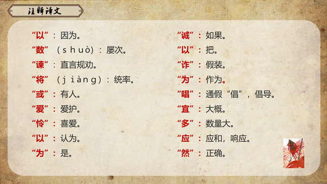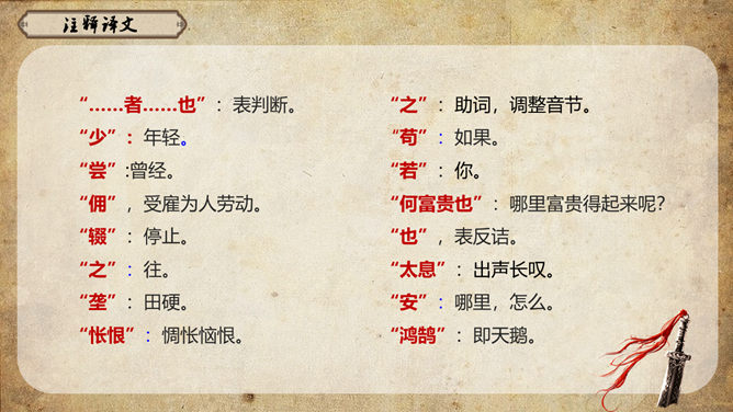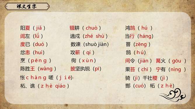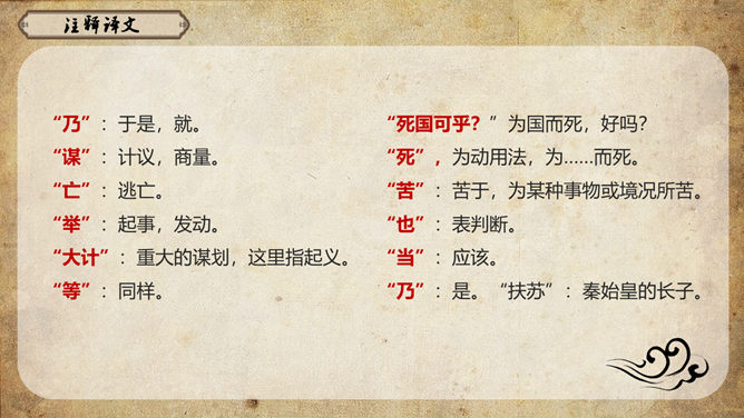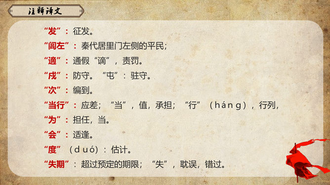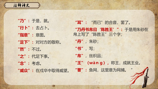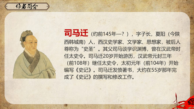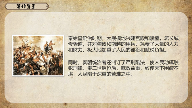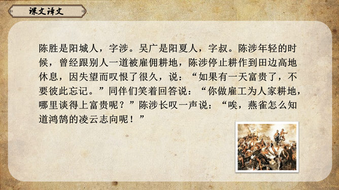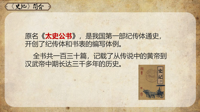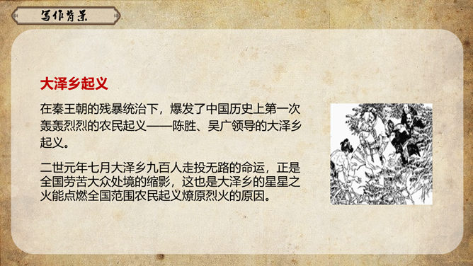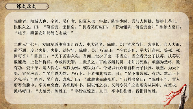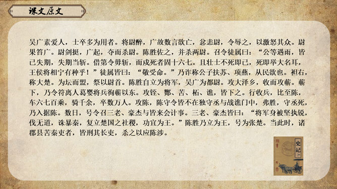 《史记》原名《太史公书》,是我国第一部纪传体通史,开创了纪传体和书表的编写体例。全书共一百三十篇,记载了从传说中的黄帝到汉武帝中期长达三千多年的历史。课文从哪几个方面来写陈胜的?从籍贯、身世、志向等方面来介绍陈胜。(1)“与人佣耕”,表明陈胜是个被剥削受压迫的穷苦农民;(2)“怅恨久之”,说明他对所处的贫困地位的不满;(3)“苟富贵,毋相忘”,表达出他有福同享的思想意识;(4)“燕雀安知鸿鹄之志哉”,用形象的比喻说明了他的远大志向。农民起义的直接原因:苛重的兵役和残酷的刑法 如:发闾左谪戍渔阳九百人。失期,法皆斩。天下苦秦久矣。起义军领袖陈胜是一个什么样的人?从课文中举例说明,年轻时就有远大的抱负。如,他在与人佣耕之时,就有“鸿鹄之志”,希望摆脱受压迫、受奴役的地位,反抗秦王朝的暴虐统治。