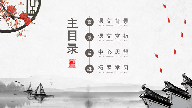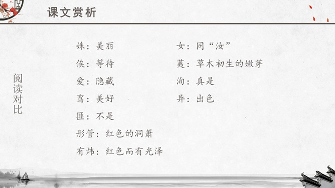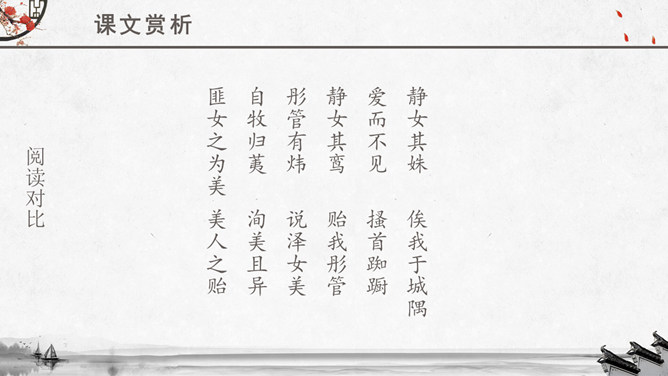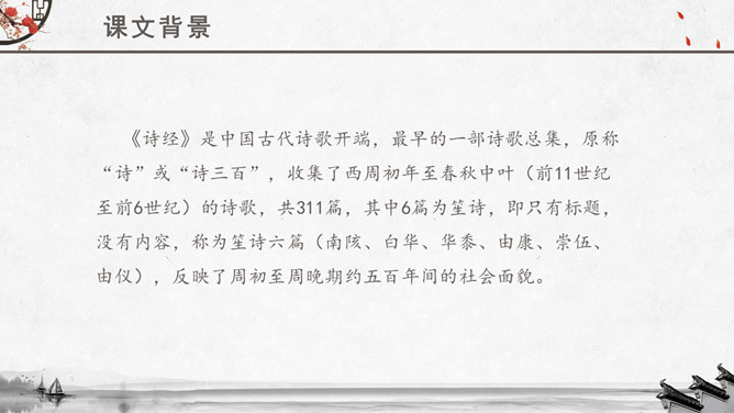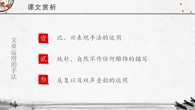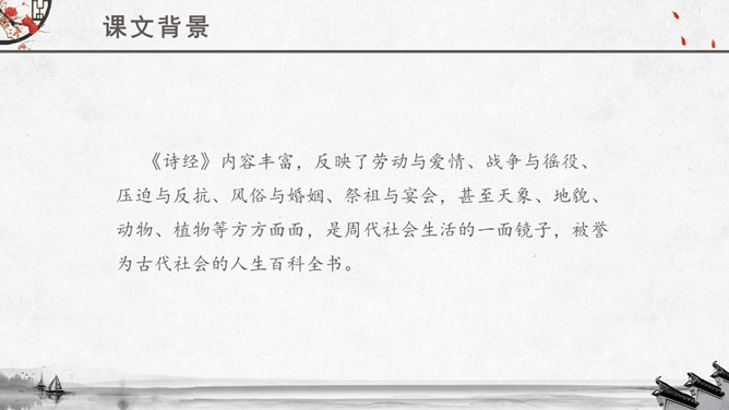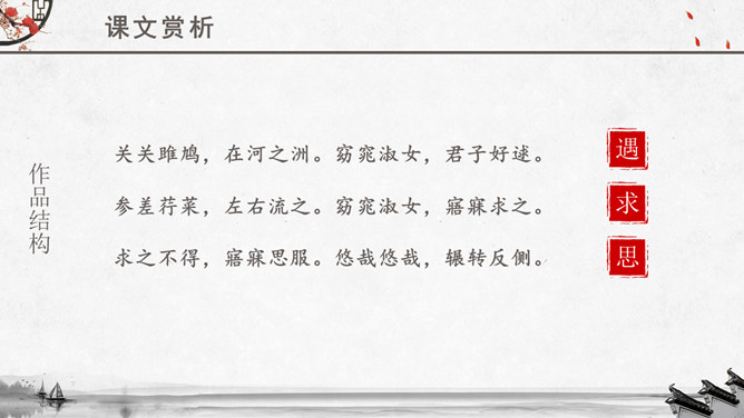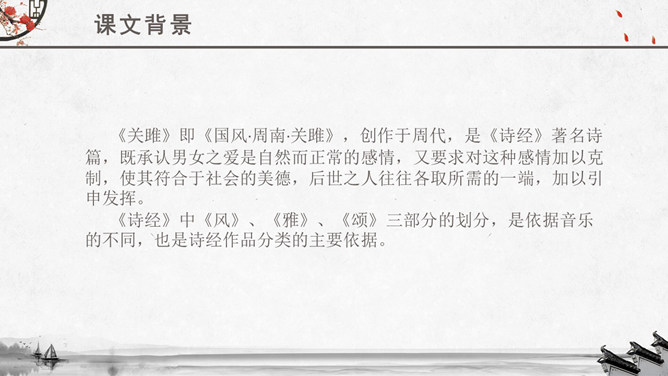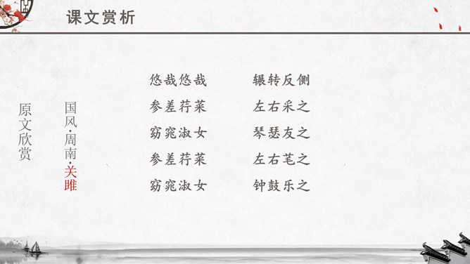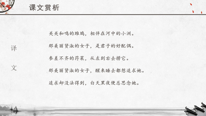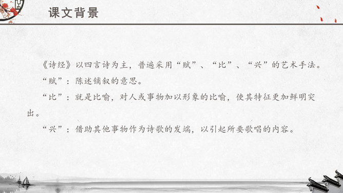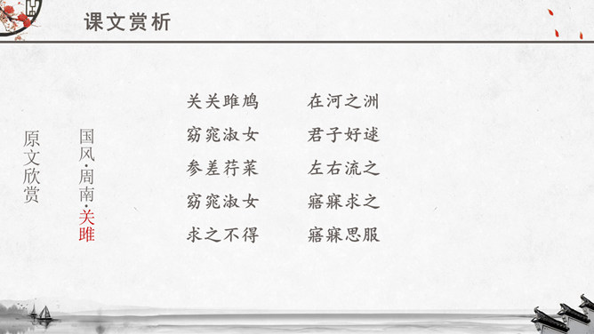 文章运用的手法:纯朴、自然不作任何雕饰的描写。比、兴表现手法的运用。反复以及双声叠韵的运用。很多人都理解为取悦淑女,让淑女高兴,才能得到欢心。其实不然,钟鼓在当时应该是礼器,平常是不会敲打的,只有在祭祀和重要礼仪,才会很庄重的“钟鼓乐之”。想一想:运用《关雎》写实的手法刻画一下你对某个异性最纯朴的喜爱之情。如何正确看待和处理对异性的喜爱之情。《诗经》内容丰富,反映了劳动与爱情、战争与徭役、压迫与反抗、风俗与婚姻、祭祖与宴会,甚至天象、地貌、动物、植物等方方面面,是周代社会生活的一面镜子,被誉为古代社会的人生百科全书。《诗经》以四言诗为主,普遍采用“赋”、“比”、“兴”的艺术手法。“赋”:陈述铺叙的意思。“比”:就是比喻,对人或事物加以形象的比喻,使其特征更加鲜明突出。“兴”:借助其他事物作为诗歌的发端,以引起所要歌唱的内容。所属专题:关雎ppt。