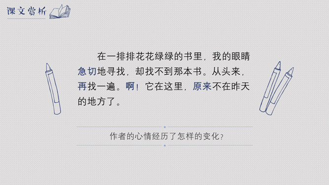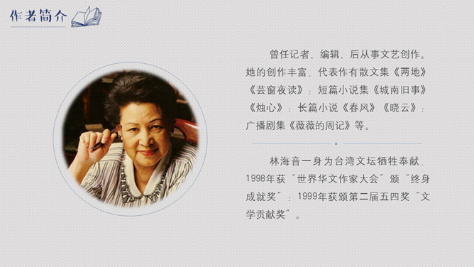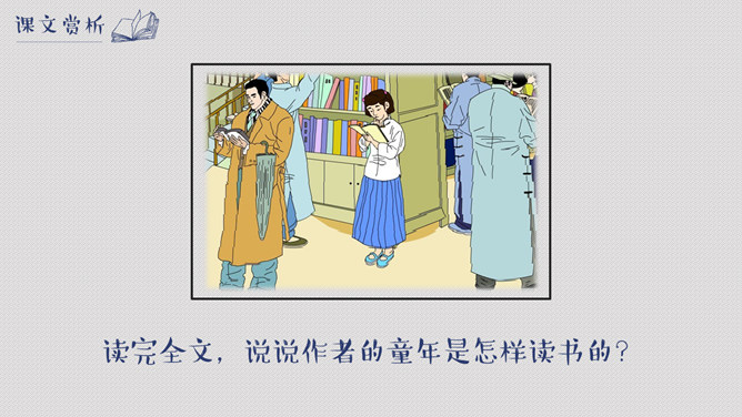 林海音一身为台湾文坛牺牲奉献,1998年获“世界华文作家大会”颁“终身成就奖”;1999年获颁第二届五四奖“文学贡献奖”。窃读记中的“记”是什么意思?本文以“记叙”为主,属于叙事散文。作者为什么要“窃读”?带着这个问题,让我们一起来读读课文。粮食哺育的是人的身体,而书籍哺育的是灵魂,一个知识与智慧不断增长的人,才是健康成长的人。读书对你意味着什么?请谈谈你平时读书的感受。关于读书的名人名言你都知道哪些呢?书是全世界的营养品。书籍是巨大的力量。——列宁。“记住,你们是吃饭长大的,也是读书长大的!”作者引用国文老师的话想说明什么?所属专题:窃读记ppt。