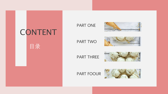 冰淇淋甜品甜点马卡龙PPT模板。一套甜品甜点美食相关模板,温暖粉色主色调,多图文排版页面。