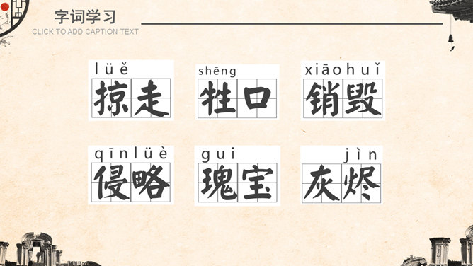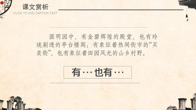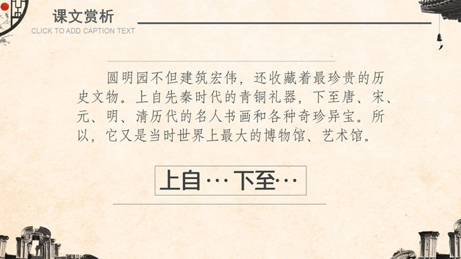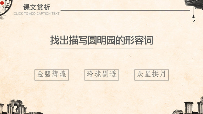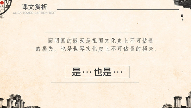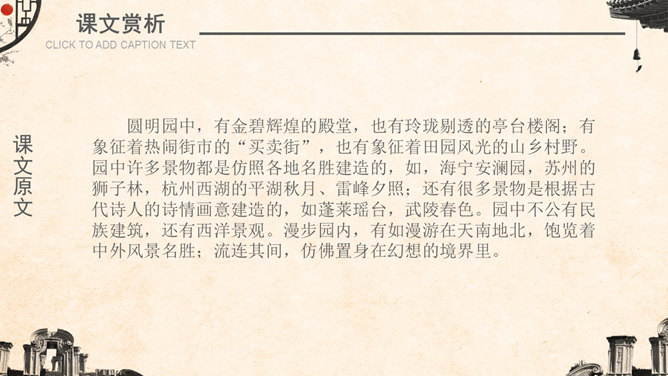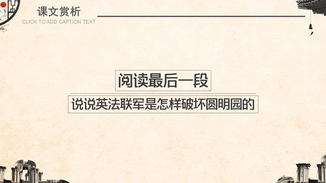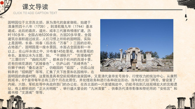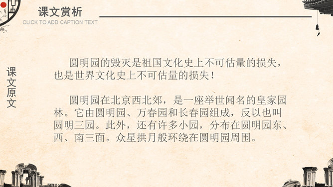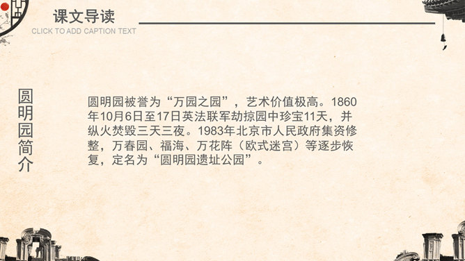 圆明园被誉为“万园之园”,艺术价值极高。1860年10月6日至17日英法联军劫掠园中珍宝11天,并纵火焚毁三天三夜。1983年北京市人民政府集资修整,万春园、福海、万花阵(欧式迷宫)等逐步恢复,定名为“圆明园遗址公园”。课文点评:课文语言简洁,结构严谨,构思颇具匠心。题目为“圆明园的毁灭”,却用了大量的篇幅写它辉煌的过去,把美的东西毁灭了,这真是一个悲剧,更能激起读者的痛心与仇恨。圆明园位于北京西北郊。原为清代的皇家御苑。始建于清康熙四十八年(1709),到清乾隆九年(1744)基本建成。此后的嘉庆、道光、咸丰三代屡有修缮扩建,历时150多年。阅读最后一段,说说英法联军是怎样破坏圆明园的。请认真思考,圆明园的毁灭对于你有什么启示。你还知道哪些中国的古建或园林,举出一两个给大家介绍一下。所属专题:圆明园的毁灭ppt。