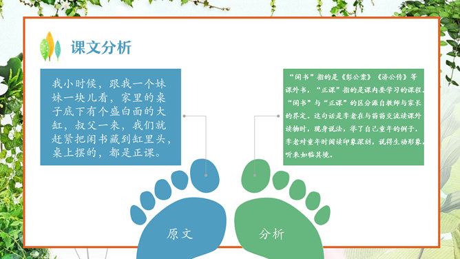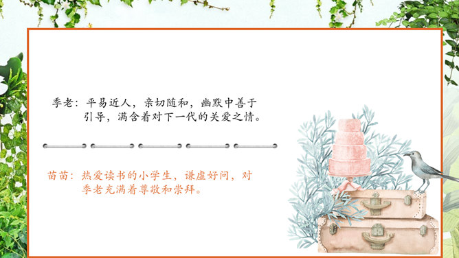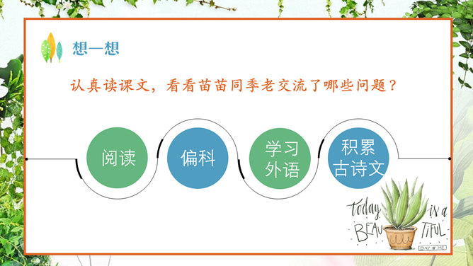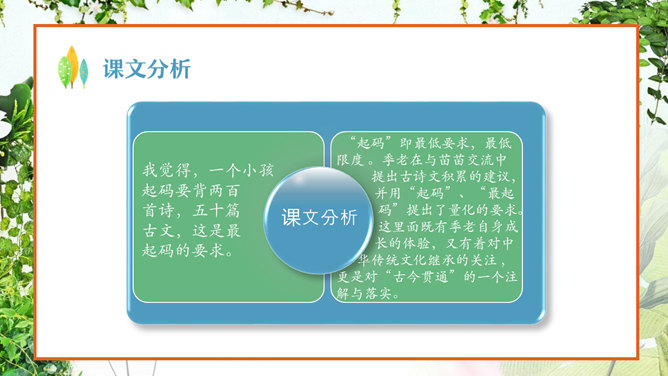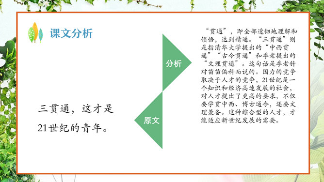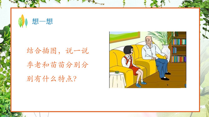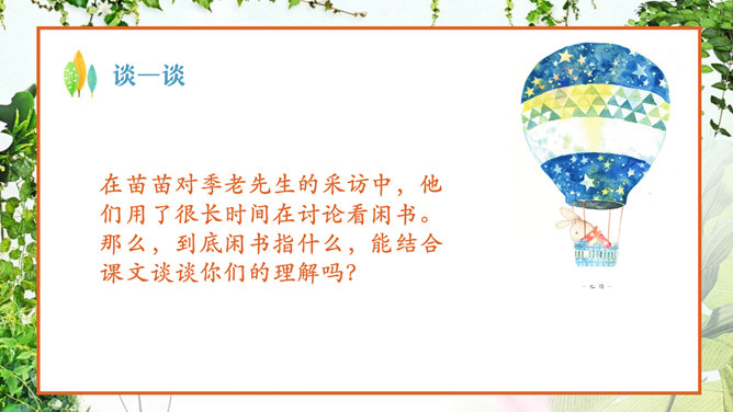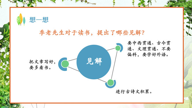 认真读课文,看看苗苗同季老交流了哪些问题 ?阅读、偏科、学习外语、积累古诗文。季老先生对于读书,提出了哪些见解?要中西贯通、古今贯通、文理贯通、不要偏科,要学好外语。进行古诗文积累。把文章写好,要多看书。在苗苗对季老先生的采访中,他们用了很长时间在讨论看闲书。那么,到底闲书指什么,能结合课文谈谈你们的理解吗?“闲书”指的是《彭公案》《济公传》等课外书,“正课”指的是课内要学习的课程。“闲书”与“正课”的区分源自教师与家长的界定。这句话是季老在与苗苗交流读课外读物时,现身说法,举了自己童年的例子。季老对童年时阅读印象深刻,说得生动形象,听来如临其境。 “起码”即最低要求,最低限度 。季老在与苗苗交流中提出古诗文积累的建议,并用“起码”、“最起码”提出了量化的要求。 这里面既有季老自身成 长的体验,又有着对中 华传统文化继承的关注 ,更是对“古今贯通”的一个注解与落实。
