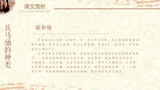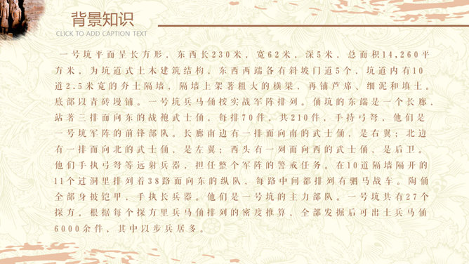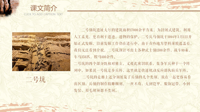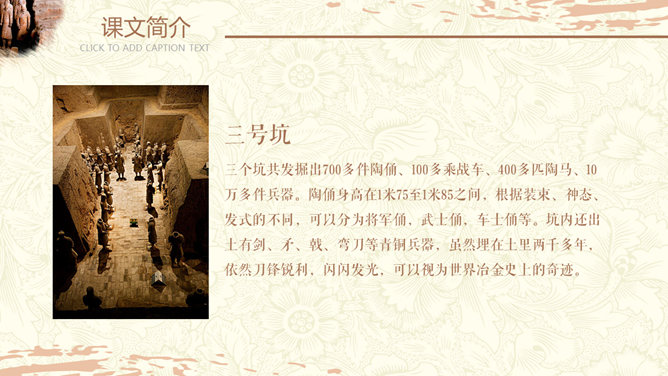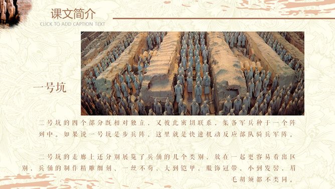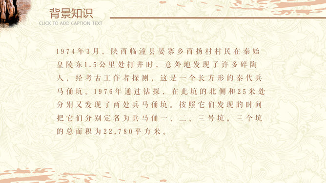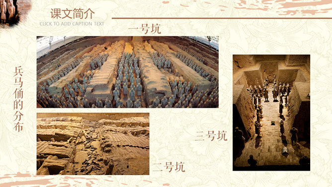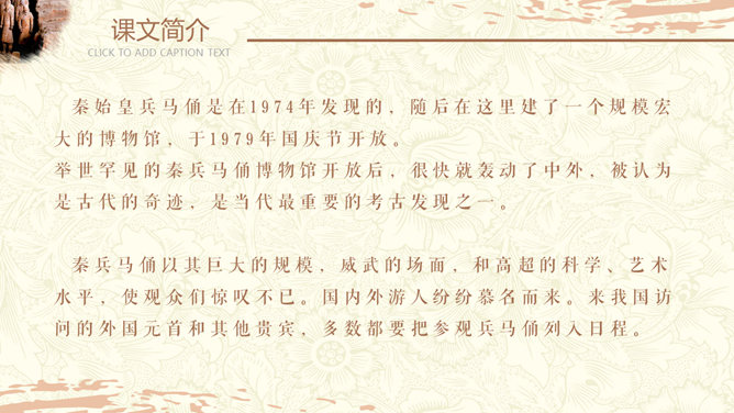 秦始皇兵马俑是在1974年发现的,随后在这里建了一个规模宏大的博物馆,于1979年国庆节开放。举世罕见的秦兵马俑博物馆开放后,很快就轰动了中外,被认为是古代的奇迹,是当代最重要的考古发现之一。秦兵马俑以其巨大的规模,威武的场面,和高超的科学、艺术水平,使观众们惊叹不已。国内外游人纷纷慕名而来。来我国访问的外国元首和其他贵宾,多数都要把参观兵马俑列入日程。亲爱的同学们:兵马俑的出土,为研究春秋战国时期尤其是秦朝的军事史提供了珍贵的实物资料,同时也掀开了中国雕塑史的重要一页。怎么样?你还知道什么兵马俑吗?请你说一说!