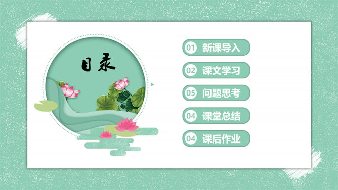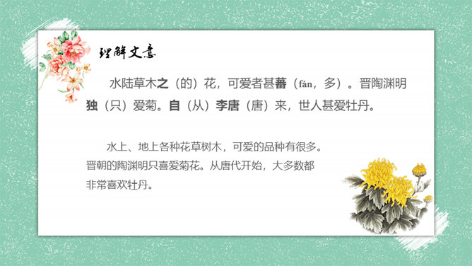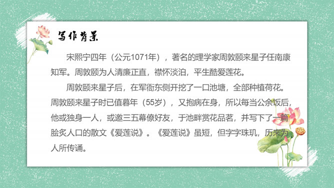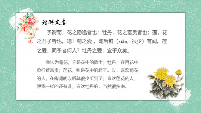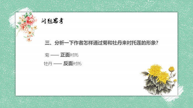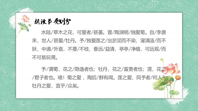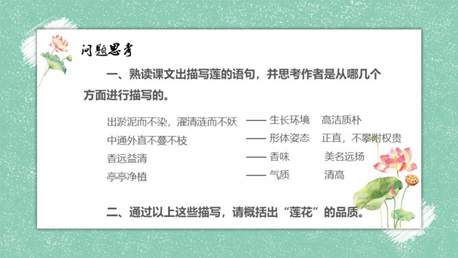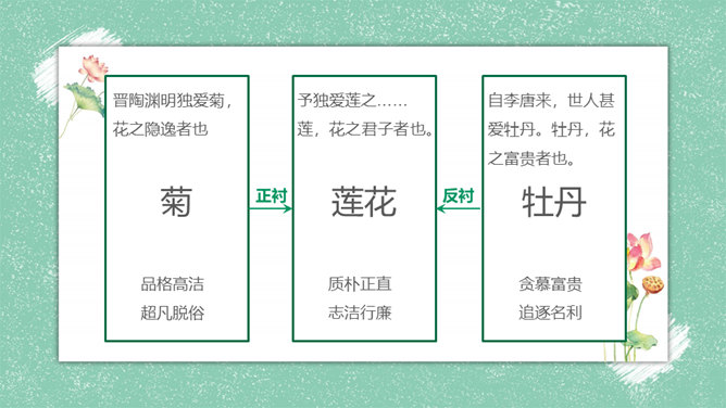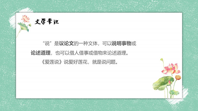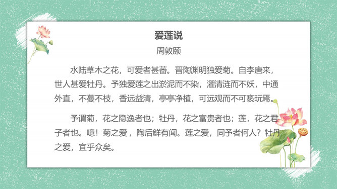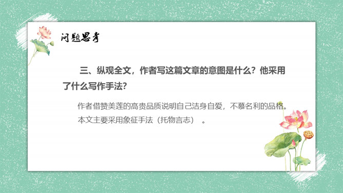 “说”是议论文的一种文体,可以说明事物或论述道理,也可以借人借事或借物来论述道理。一、熟读课文出描写莲的语句,并思考作者是从哪几个方面进行描写的。出淤泥而不染,濯清涟而不妖 中通外直不蔓不枝 香远益清 亭亭净植。二、通过以上这些描写,请概括出“莲花”的品质。三、分析一下作者怎样通过菊和牡丹来衬托莲的形象?菊 —— 正面衬托,牡丹 —— 反面衬托。三、纵观全文,作者写这篇文章的意图是什么?他采用了什么写作手法? 作者借赞美莲的高贵品质说明自己洁身自爱,不慕名利的品格。本文主要采用象征手法(托物言志)。作业:1. 背诵课文。2. 采用象征的写作手法写一篇小短文或歌词,题目自拟。所属专题:爱莲说ppt。
