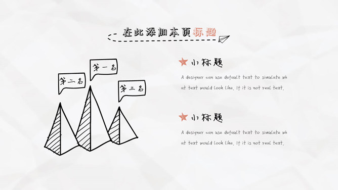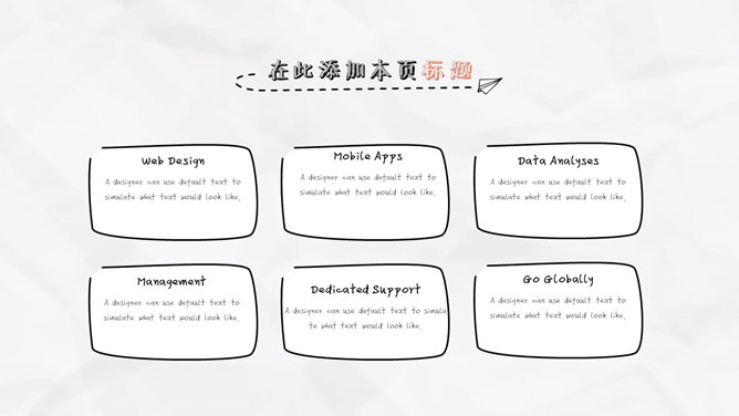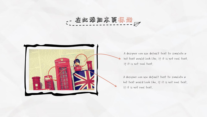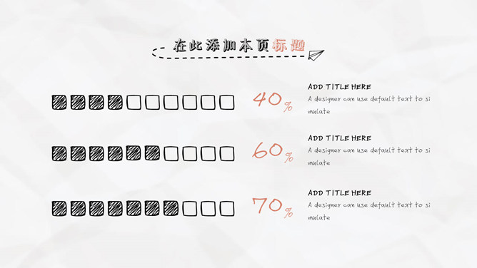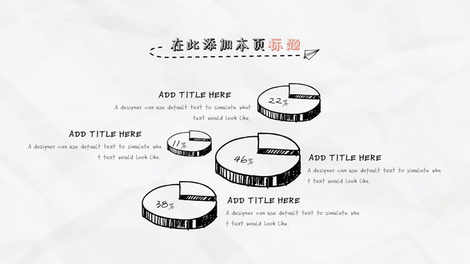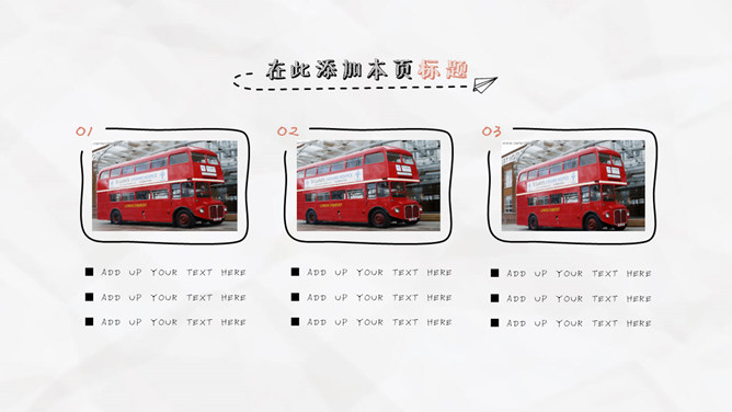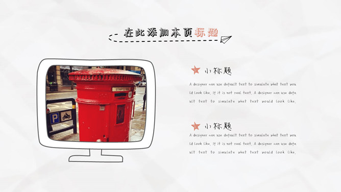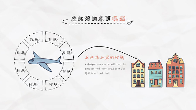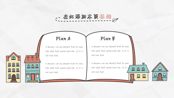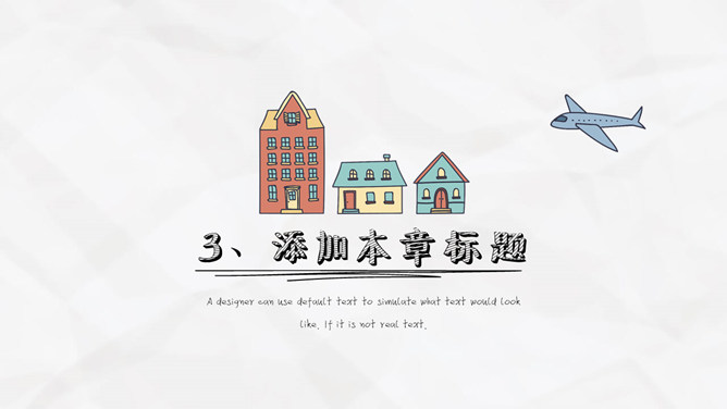 城市房子可爱卡通手绘PPT模板。一套卡通风格幻灯片模板,可爱手绘设计,纸质纹理背景,城市房子建筑元素。