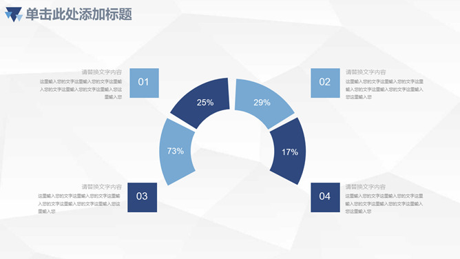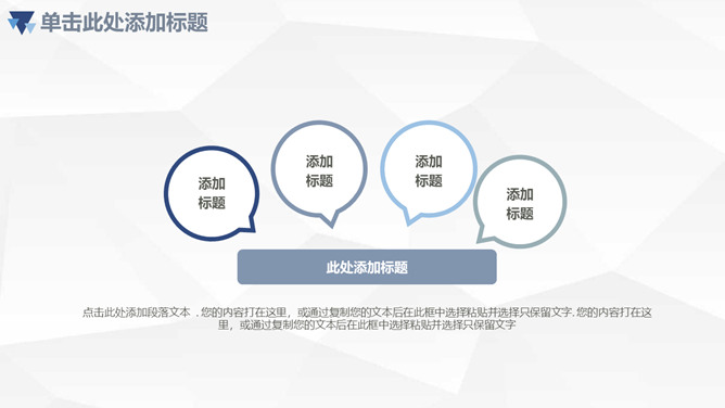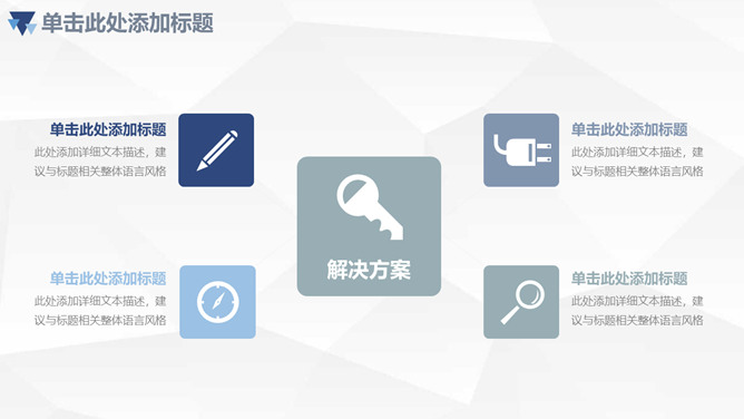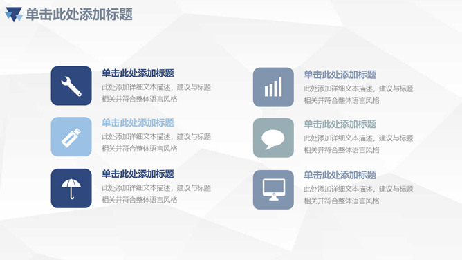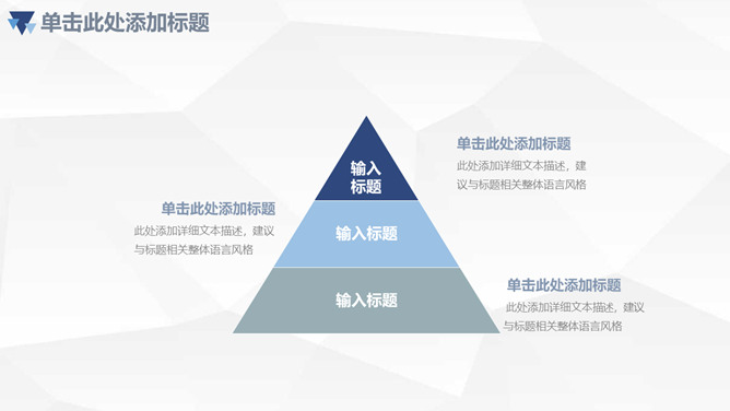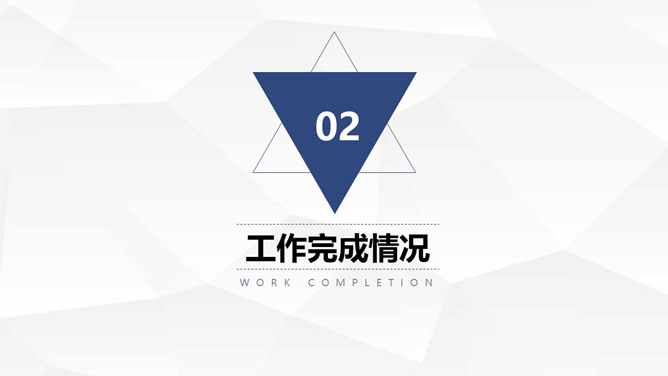 三角年中总结计划汇报PPT模板。一套年中工作总结计划汇报幻灯片模板,浅灰色低面几何多边形背景,清爽蓝色主色调,三角形装饰,页面丰富实用。