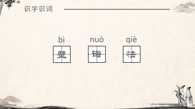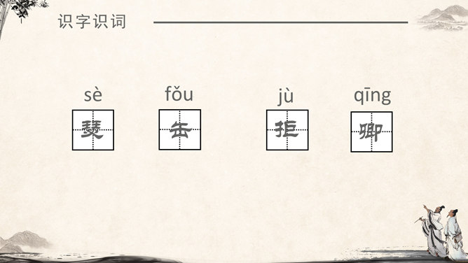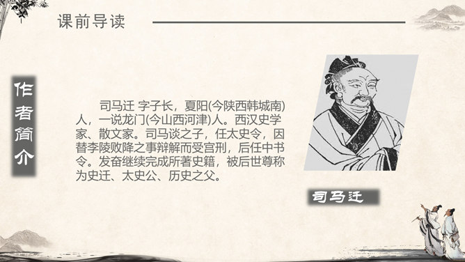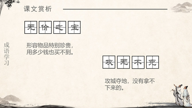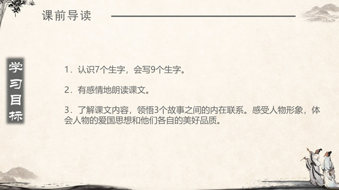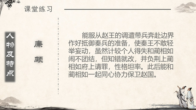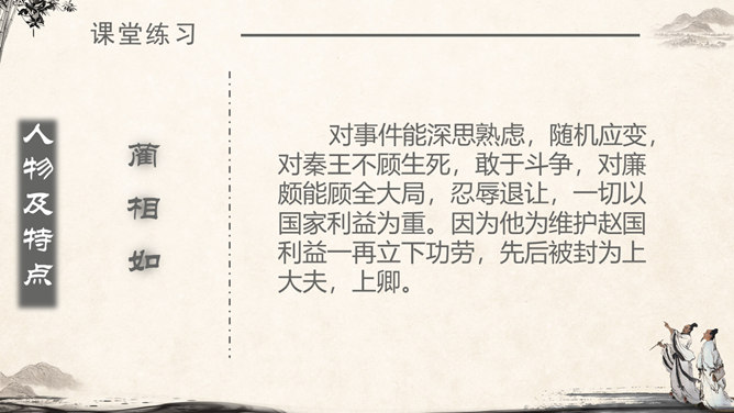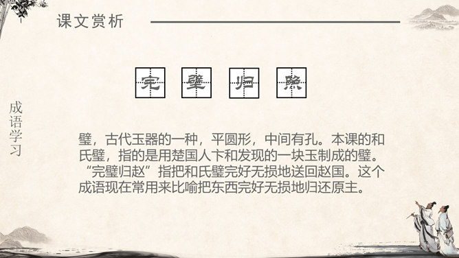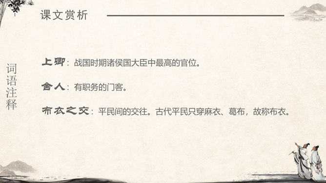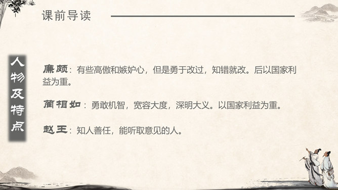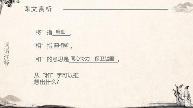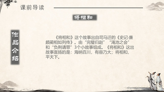 《将相和》这个故事出自司马迁的《史记·廉颇蔺相如列传》。由“完璧归赵”“渑池之会”和“负荆请罪”3个小故事组成。《将相和》这出故事宣扬的是:海纳百川,有容乃大;将相和,平天下。人物及特点:廉颇:有些高傲和嫉妒心,但是勇于改过,知错就改。后以国家利益为重。蔺相如 :勇敢机智,宽容大度,深明大义。以国家利益为重。赵王:知人善任,能听取意见的人。学习目标:1.认识7个生字,会写9个生字。2.有感情地朗读课文。3.了解课文内容,领悟3个故事之间的内在联系。感受人物形象,体会人物的爱国思想和他们各自的美好品质。词语注释:上卿:战国时期诸侯国大臣中最高的官位。舍人:有职务的门客。布衣之交:平民间的交往。古代平民只穿麻衣、葛布,故称布衣。怒发上冲冠:愤怒得头发直竖,顶起了冠。形容极其愤怒。固请:坚决请求(相如不要把璧撞破)。详为:假装做。详,同“佯”,假装。