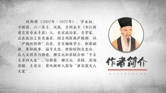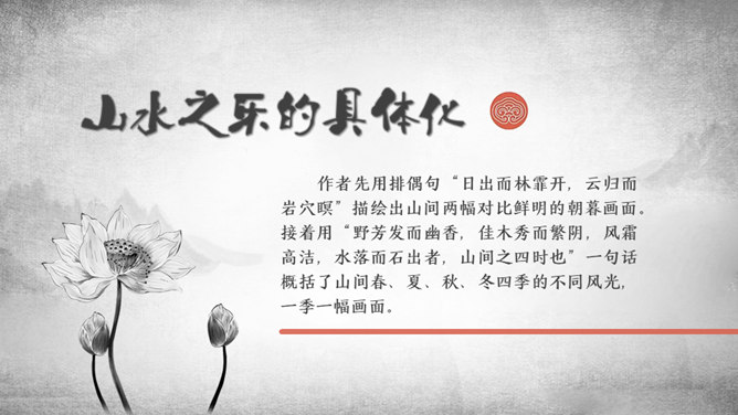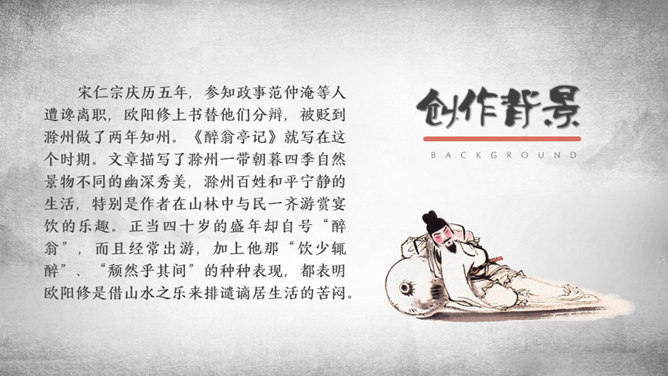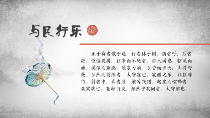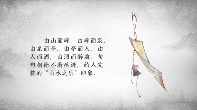 游乐场景映在太守的眼里,便多了一层政治清明的意味。接着写太守设宴,众宾宴饮之乐。宴席丰盛而充满野趣,众宾起坐喧哗,乐不可支。太守乐中酒酣而醉,此醉是为山水之乐而醉,更为能与吏民同乐而醉。体现太守与下属关系融洽,“政通人和”才能有这样的乐。复杂的心情:作者巧妙地用禽鸟之乐衬托游人之乐,又以游人之乐衬托太守之乐。但太守之乐与众不同,不是众人所能理解的。作者并没有袒露胸怀,只含蓄地说:“醉能同其乐,醒能述以文者,太守也。”所属专题:醉翁亭记ppt。