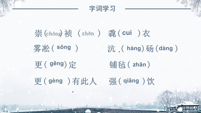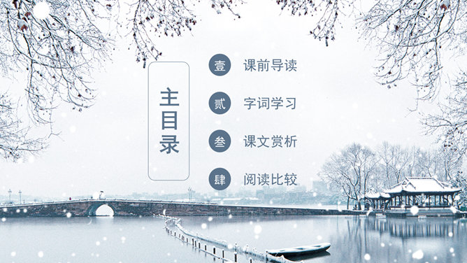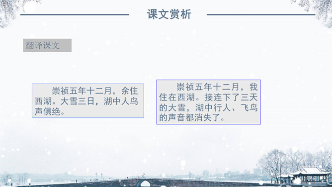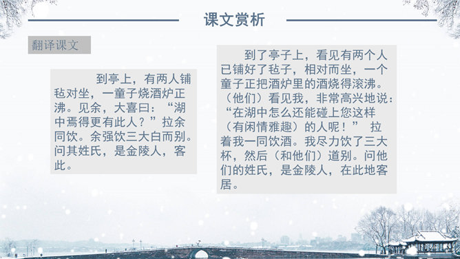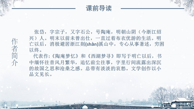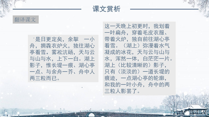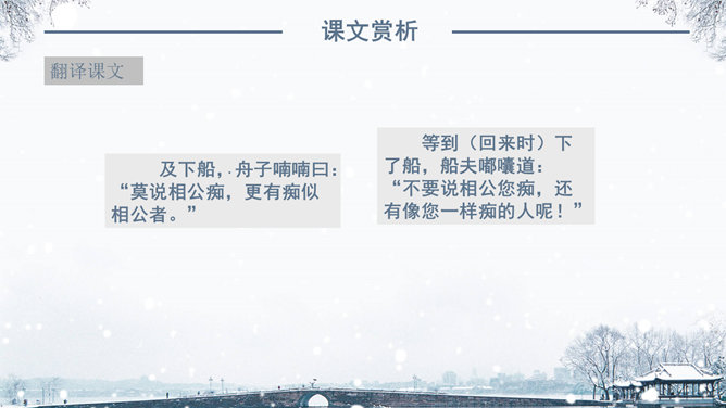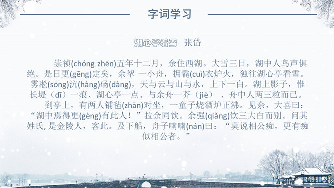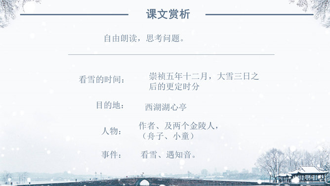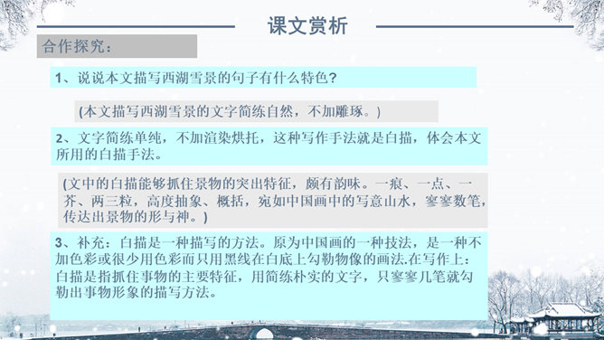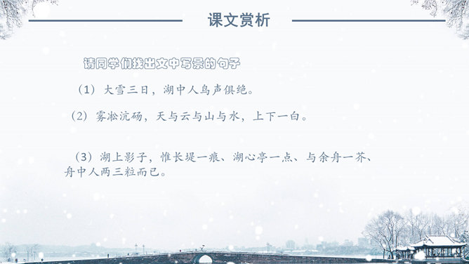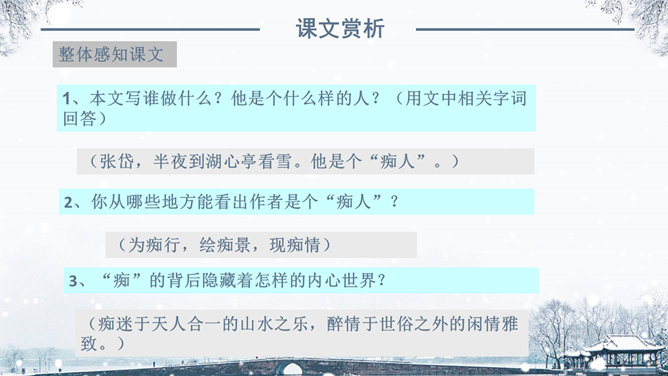 整体感知课文:1、本文写谁做什么?他是个什么样的人?(用文中相关字词回答)张岱,半夜到湖心亭看雪。他是个“痴人”。2、你从哪些地方能看出作者是个“痴人”?为痴行,绘痴景,现痴情。3、“痴”的背后隐藏着怎样的内心世界? 痴迷于天人合一的山水之乐,醉情于世俗之外的闲情雅致。请同学们找出文中写景的句子。1、说说本文描写西湖雪景的句子有什么特色?本文描写西湖雪景的文字简练自然,不加雕琢。2、文字简练单纯,不加渲染烘托,这种写作手法就是白描,体会本文所用的白描手法。文中的白描能够抓住景物的突出特征,颇有韵味。一痕、一点、一芥、两三粒,高度抽象、概括,宛如中国画中的写意山水,寥寥数笔,传达出景物的形与神。3、补充:白描是一种描写的方法。原为中国画的一种技法,是一种不加色彩或很少用色彩而只用黑线在白底上勾勒物像的画法.在写作上:白描是指抓住事物的主要特征,用简练朴实的文字,只寥寥几笔就勾勒出事物形象的描写方法。所属专题:湖心亭看雪ppt。