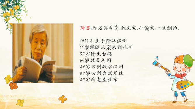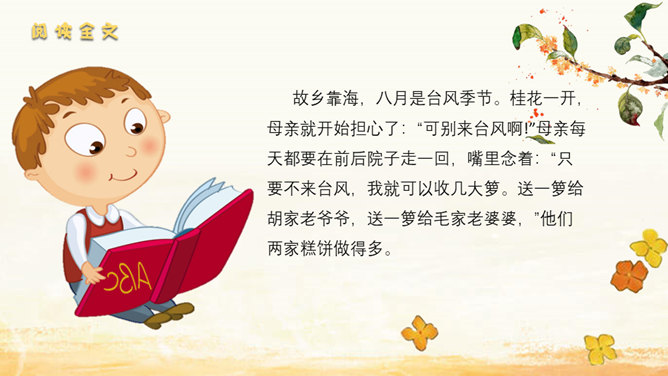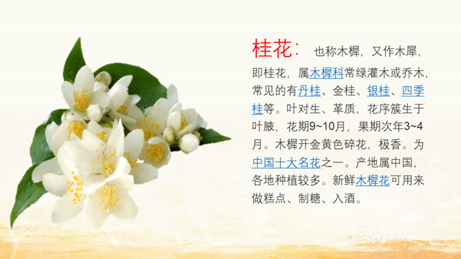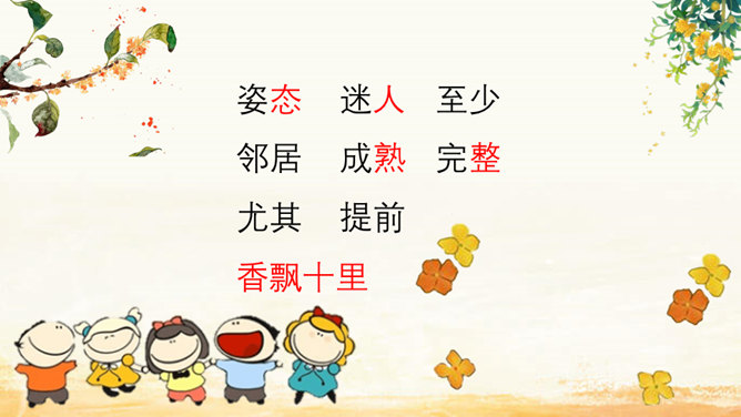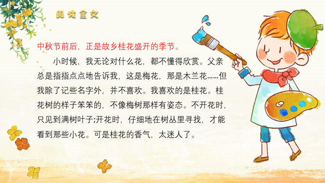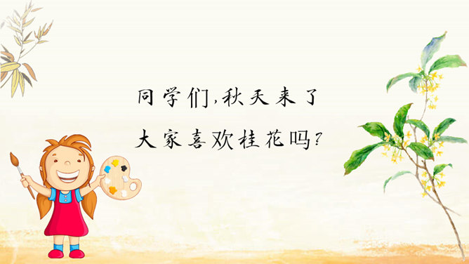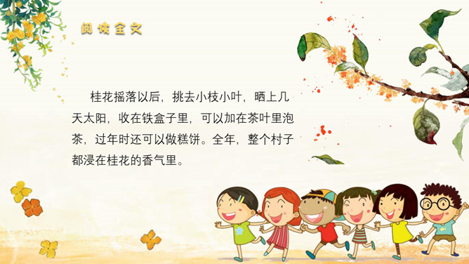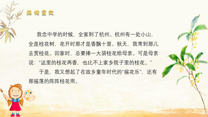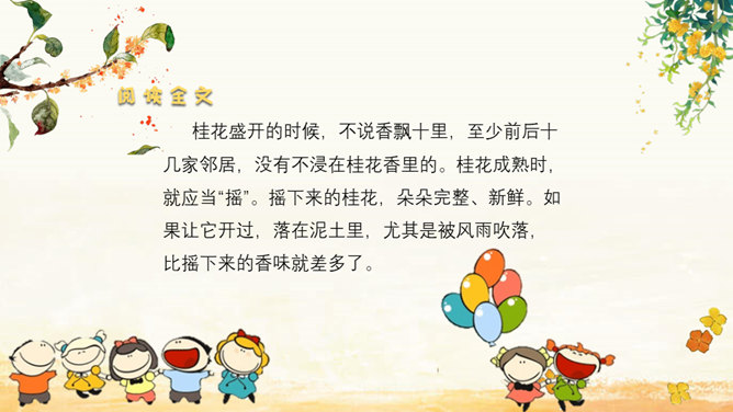 家乡院子里的桂花到底有多香呢?请同学们默读课文,找出描写家乡院子里桂花香的句子。我抱着桂花树,使劲地摇,摇啊摇,摇啊摇。我仿佛看到了桂花像春天——小雨点似的;像夏天里翩然起舞的——蝴蝶;像秋天的——落叶;像冬天的精灵——小雪花似的,从空中纷纷扬扬地飘落。同学们,秋天来了大家喜欢桂花吗?桂花:也称木樨,又作木犀,即桂花,属木樨科常绿灌木或乔木,常见的有丹桂、金桂、银桂、四季桂等。叶对生、革质,花序簇生于叶腋,花期9~10月,果期次年3~4月。木樨开金黄色碎花,极香。读课文,这篇课文作者先写 我最喜欢桂花,接着写摇桂花,最后写赏桂花。所属专题:桂花雨ppt。