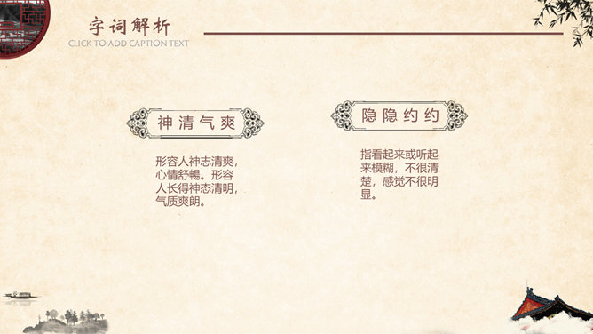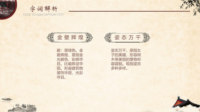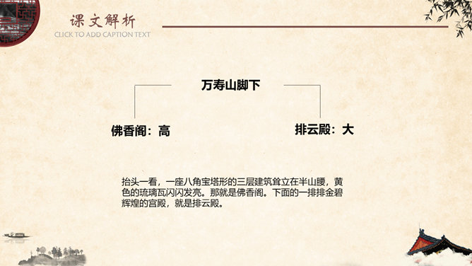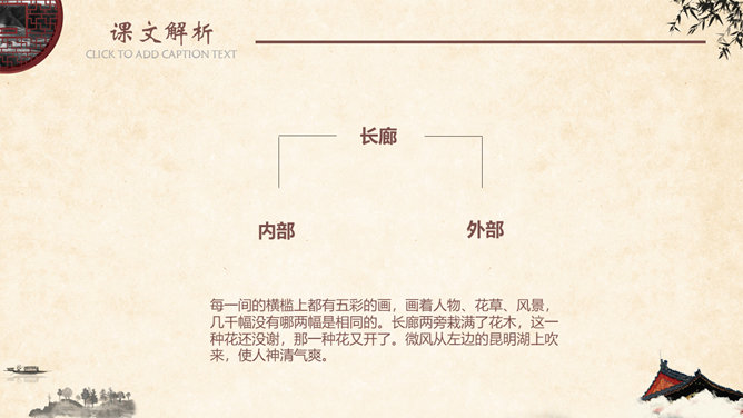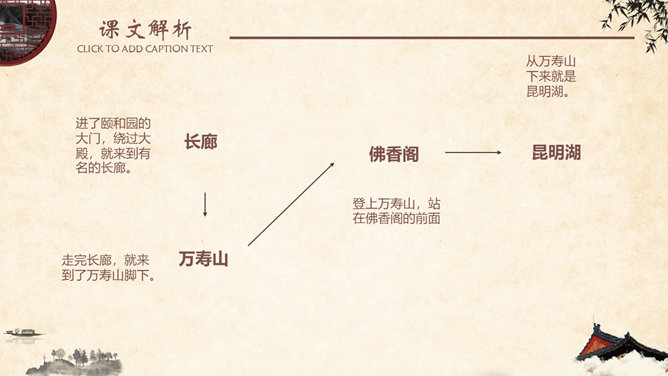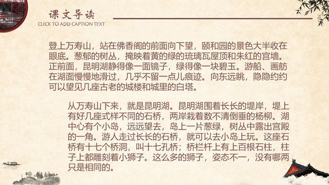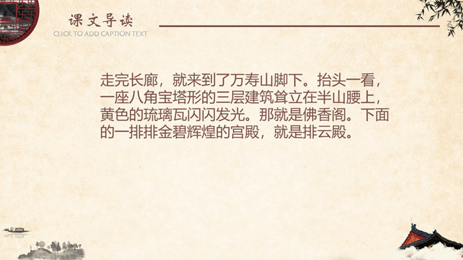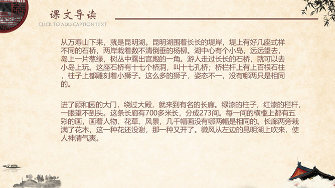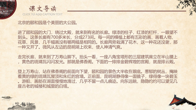 金壁辉煌,碧:翠绿色。金碧辉煌,意指金光碧色,彩辉夺目。比喻陈设华丽。形容建筑物装饰华丽,光彩夺目。姿态万千,原指女子的美媚,形容树木等美丽的景物形容容貌。现指姿态多种多样。神清气爽,形容人神志清爽,心情舒暢。形容人长得神态清明,气质爽朗。隐隐约约,指看起来或听起来模糊,不很清楚,感觉不很明显。葱郁,指青翠繁盛貌。语出《宋史·乐志十》:“氤氲成雾,葱郁垂阴。遮蔽;隐蔽。谓或遮或露,时隐时现。 遮映衬托。盖过,压倒。出处观巴黎油画记。仿照《18 颐和园》介绍景观的写作手法,你也能用上一定的表达手法、按照一定的顺序向我们介绍你曾经去过的一处景观吗?长廊、佛香阁、昆明湖等景物的特点不同,作者描写的方法也不一样,请找出描写这些景物的句子。颐和园的景美,课文的语言也很美,把喜欢的部分背下来。所属专题:颐和园ppt。