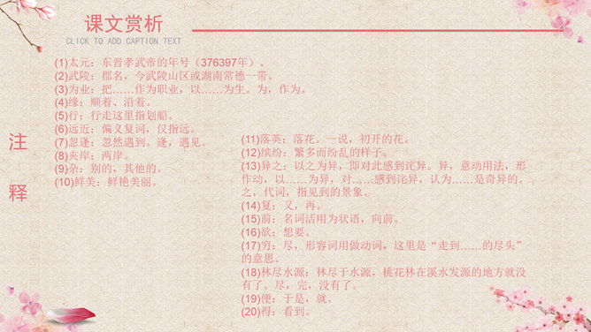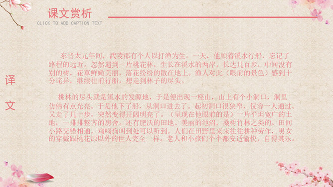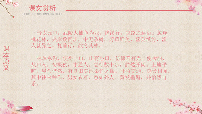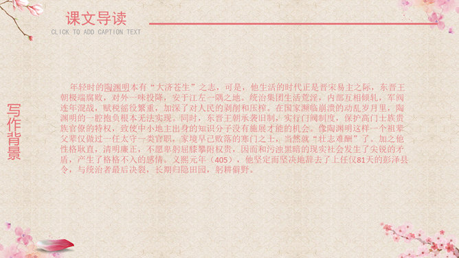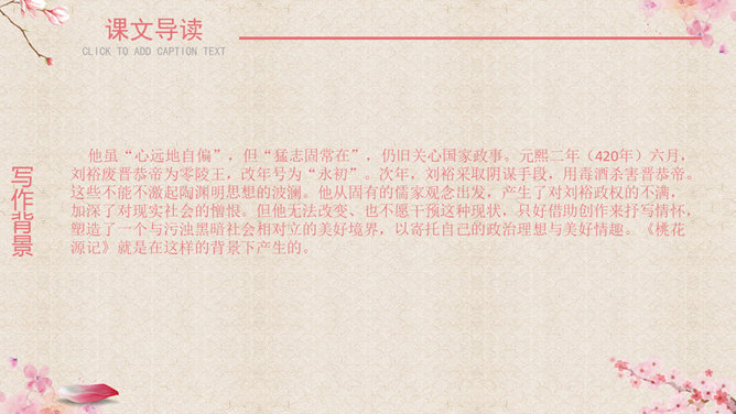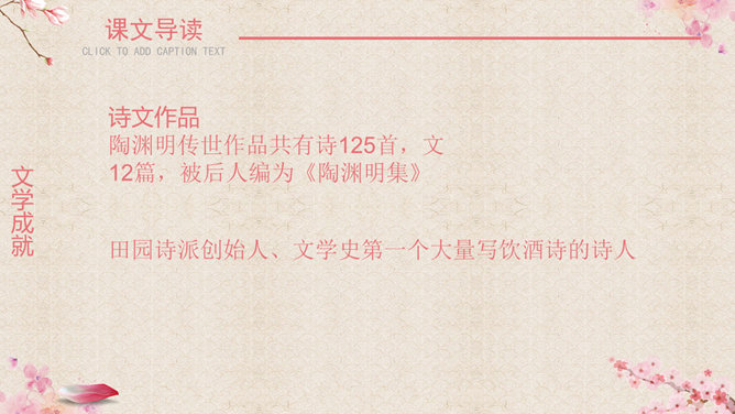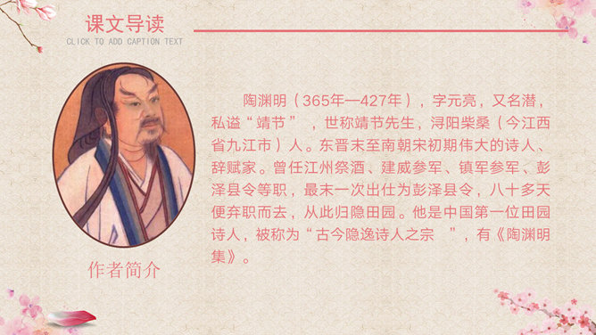 陶渊明传世作品共有诗125首,文12篇,被后人编为《陶渊明集》。田园诗派创始人、文学史第一个大量写饮酒诗的诗人。年轻时的陶渊明本有“大济苍生”之志,可是,他生活的时代正是晋宋易主之际,东晋王朝极端腐败,对外一味投降,安于江左一隅之地。他虽“心远地自偏”,但“猛志固常在”,仍旧关心国家政事。请描述一下桃花源的景致。请描述一下桃花源的景致。桃花源的秘密是什么?为什么“不足为外人道也。”阅读《桃花源诗》,和《桃花源记》做对比。所属专题:桃花源记ppt。