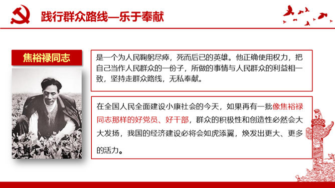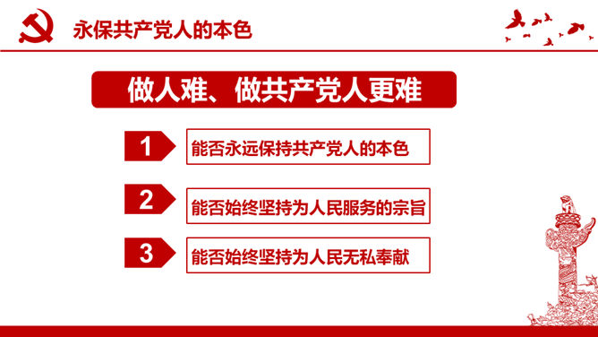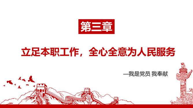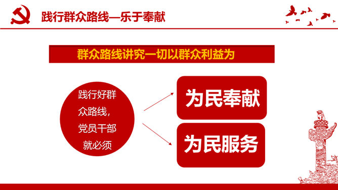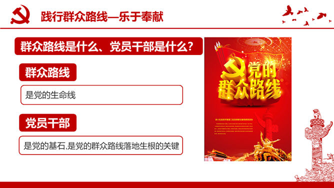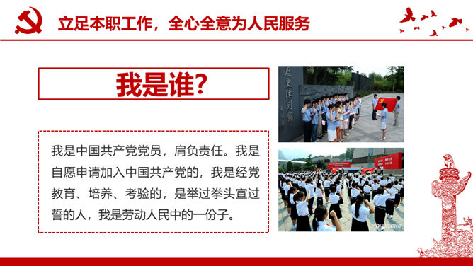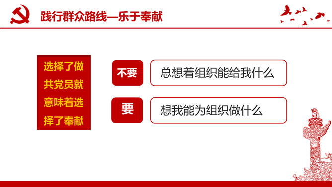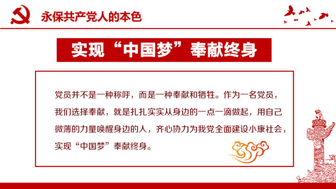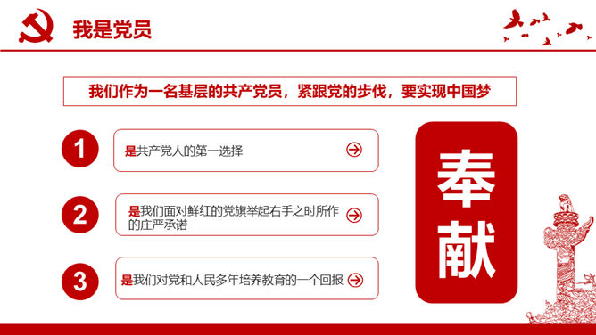 我是党员我奉献党课PPT模板。一套实用党课课件幻灯片模板,包括我是党员、践行群众路线、全心全意为人民服务、永保共产党人的本色几个部分。