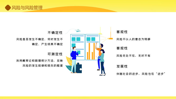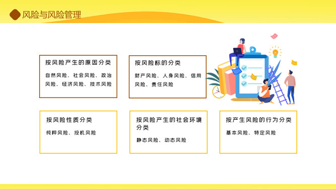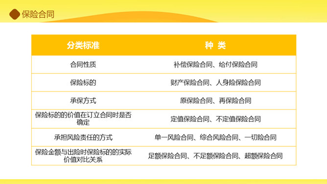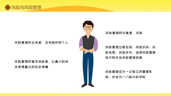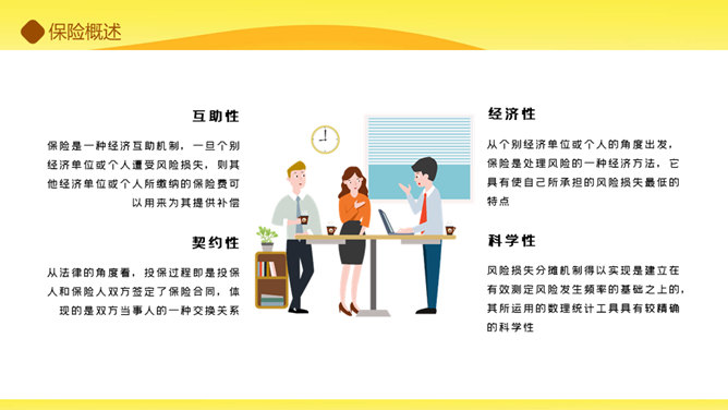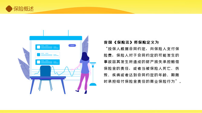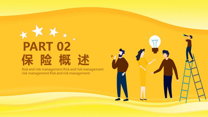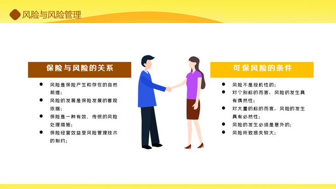 理财保险知识培训PPT模板。一套金融理财、保险知识培训幻灯片模板,包括风险与风险管理、保险概述、保险合同、保险基本原则几个部分。