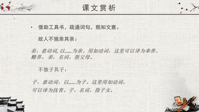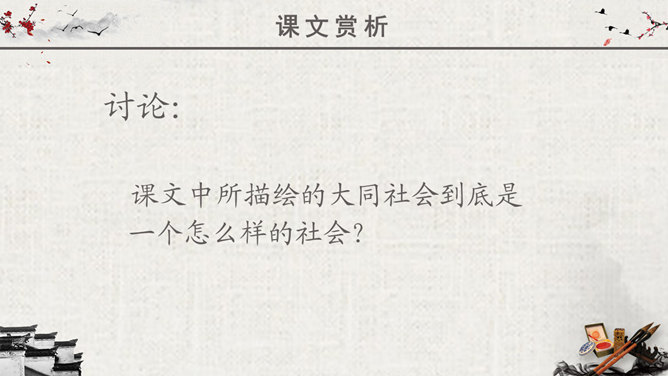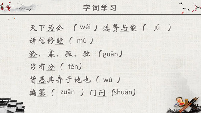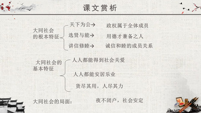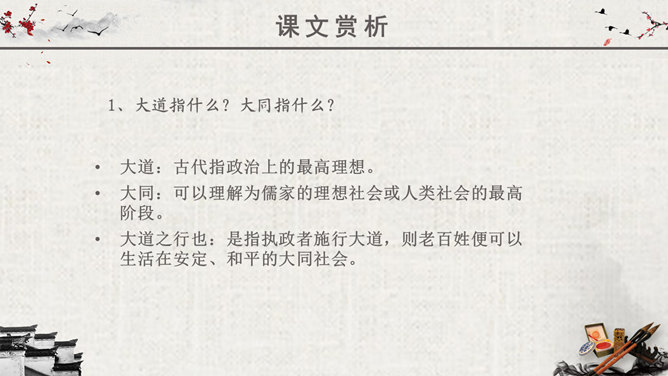学习目标:掌握《礼记》的基本知识。整体感知课文,理清文章脉络,领悟“大同”社会的实质。领悟古人所追求的理想社会的实质,培养以天下为己任的理想情操。背诵并默写课文。《大道之行也 》选自《礼记》,儒家经典之一。选自《礼记•礼运》,该书大约是战国末年或秦汉之际儒家学者托名孔子答问的著作。 文章中提出一个著名的关于人类美好社会的构想,并给它定名为“大同”。请注意理解“天下为公”这个关键词理,清课文的层次,然后分析“大同” 社会的基本特征。 借助工具书,疏通词句,粗知文意。 课文中所描绘的大同社会到底是一个怎么样的社会?1、大道指什么?大同指什么?大道:古代指政治上的最高理想。大同:可以理解为儒家的理想社会或人类社会的最高阶段。大道之行也:是指执政者施行大道,则老百姓便可以生活在安定、和平的大同社会。2、 “大同”社会和陶渊明描绘的那个“世外桃源”有哪些相同的地方?两者都描绘了一个没有战乱,没有剥削、压迫,人人平等,人人安居乐业,和睦相处,丰衣足食的理想社会。