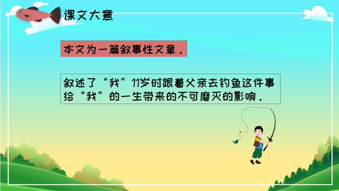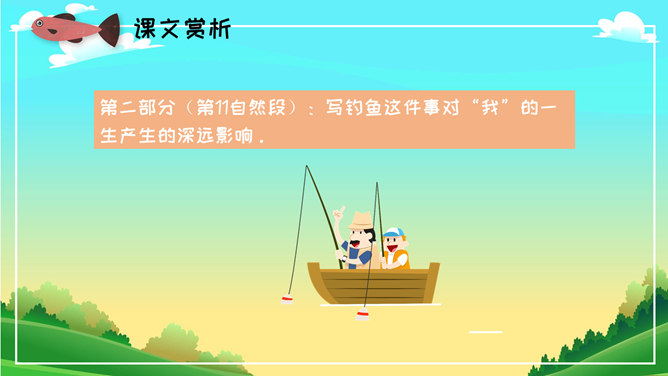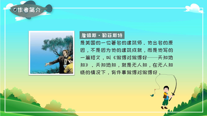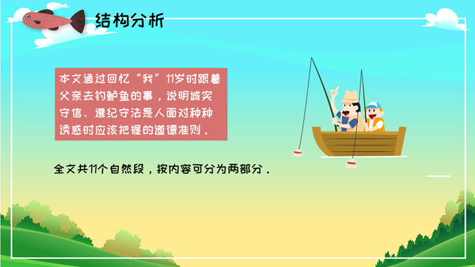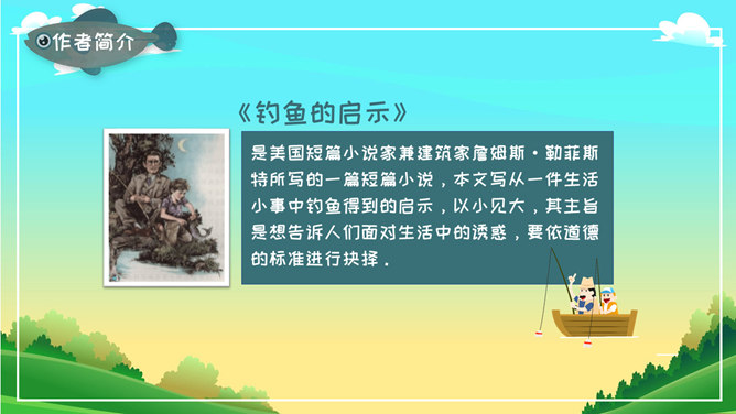 《钓鱼的启示》是美国短篇小说家兼建筑家詹姆斯·勒菲斯特所写的一篇短篇小说,本文写从一件生活小事中钓鱼得到的启示,以小见大,其主旨是想告诉人们面对生活中的诱惑,要依道德的标准进行抉择。本文为一篇叙事性文章。叙述了“我”11岁时跟着父亲去钓鱼这件事给“我”的一生带来的不可磨灭的影响。本文通过回忆“我”11岁时跟着父亲去钓鲈鱼的事,说明诚实守信、遵纪守法是人面对种种诱惑时应该把握的道德准则。全文共11个自然段,按内容可分为两部分。第一部分(第1~10自然段),又分了两层叙写。第一层(第1~3自然段):写11岁时,“我”跟着父亲在鲈鱼捕捞开放日的前一天傍晚去钓鱼,我钓到了一条好大的鲈鱼。第二层(第4~10自然段):写父亲让“我”把鱼放了,“我”非常不理解,心情沮丧极了。第二部分(第11自然段):写钓鱼这件事对“我”的一生产生的深远影响。启示:道德问题虽然只是一个简单的正确或错误的问题,但是实施起来却有一定的难度,特别是当你面对着很大的诱惑的时候。