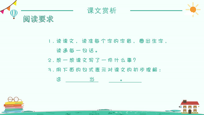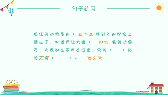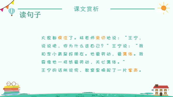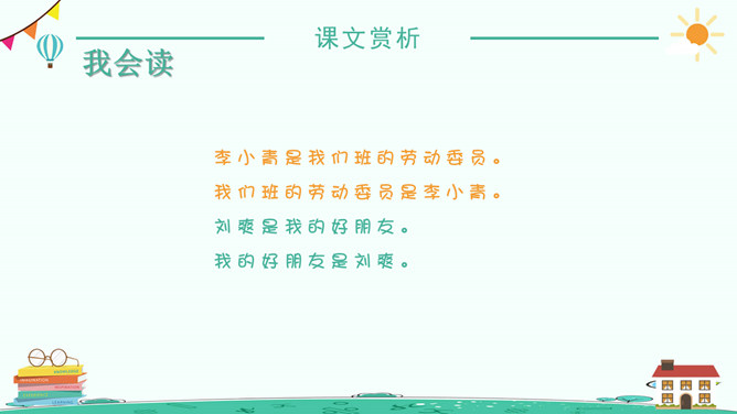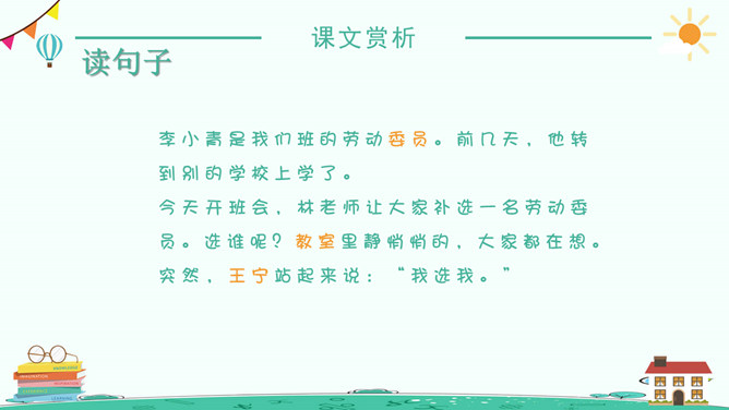 读课文,读准每个字的字音,圈出生字,读通每一句话。想一想课文写了一件什么事?用下面的句式表示对课文的初步理解 。王宁选自己当劳动委员,课文是怎么写的呢?王宁当选劳动委员后,你认为他会做些什么?李小青是我们班的劳动委员。我们班的劳动委员是李小青。刘爽是我的好朋友。我的好朋友是刘爽。