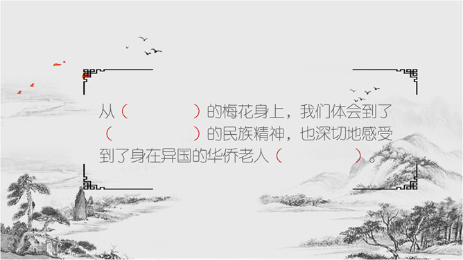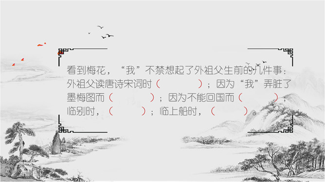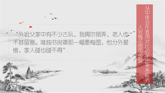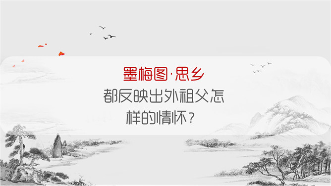 墨梅图·思乡,都反映出外祖父怎样的情怀?颇负盛名 ,解析:颇,相当地。负,享有。盛名,很大的名望。颇负盛名,有很大的名望。顶天立地,解析:头顶青天,脚立在地上。形容光明正大,形象高大,气概豪迈。不甚在意,解析:不怎么放在心上 不甚: 1.表示程度不很高。 在意: 1.留意;放在心上。通过回忆哪几件具体的事情反映外祖父对祖国的眷恋之情?一、吟诗落泪。二、珍爱墨梅图。三、因不能回国而痛哭。四、送墨梅图。五、送绣梅手绢。搜集赞颂梅花的诗句,学做有梅花的秉性的人。妙笔生花写诗或文:倾吐你想对海外游子说的话。所属专题:梅花魂ppt。